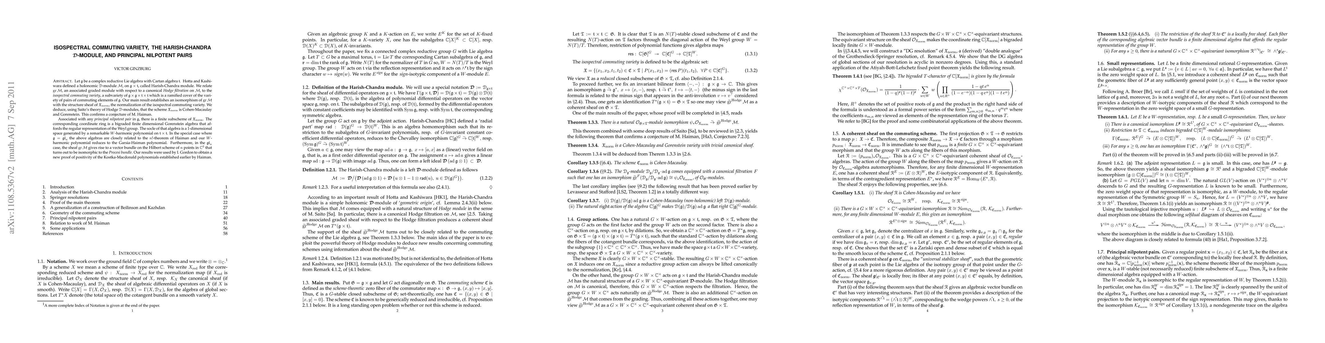Let g be a complex reductive Lie algebra with Cartan algebra h. Hotta and Kashiwara defined a holonomic D-module M, on g x h, called Harish-Chandra module. We relate gr(M), an associated graded module with respect to a canonical Hodge filtration on M, to the isospectral commuting variety, a subvariety of g x g x h x h which is a ramified cover of the variety of pairs of commuting elements of g. Our main result establishes an isomorphism of gr(M) with the structure sheaf of X_norm, the normalization of the isospectral commuting variety. It follows, thanks to the theory of Hodge modules, that the normalization of the isospectral commuting variety is Cohen-Macaulay and Gorenstein, confirming a conjecture of M. Haiman. We deduce, using Saito's theory of Hodge D-modules, that the scheme X_norm is Cohen-Macaulay and Gorenstein. This confirms a conjecture of M. Haiman. Associated with any principal nilpotent pair in g, there is a finite subscheme of X_norm. The corresponding coordinate ring is a bigraded finite dimensional Gorenstein algebra that affords the regular representation of the Weyl group. The socle of that algebra is a 1-dimensional vector space generated by a remarkable W-harmonic polynomial on h x h. In the special case where g=gl_n the above algebras are closely related to the n!-theorem of Haiman and our W-harmonic polynomial reduces to the Garsia-Haiman polynomial. Furthermore, in the gl_n case, the sheaf gr(M) gives rise to a vector bundle on the Hilbert scheme of n points in C^2 that turns out to be isomorphic to the Procesi bundle. Our results were used by I. Gordon to obtain a new proof of positivity of the Kostka-Macdonald polynomials established earlier by Haiman.