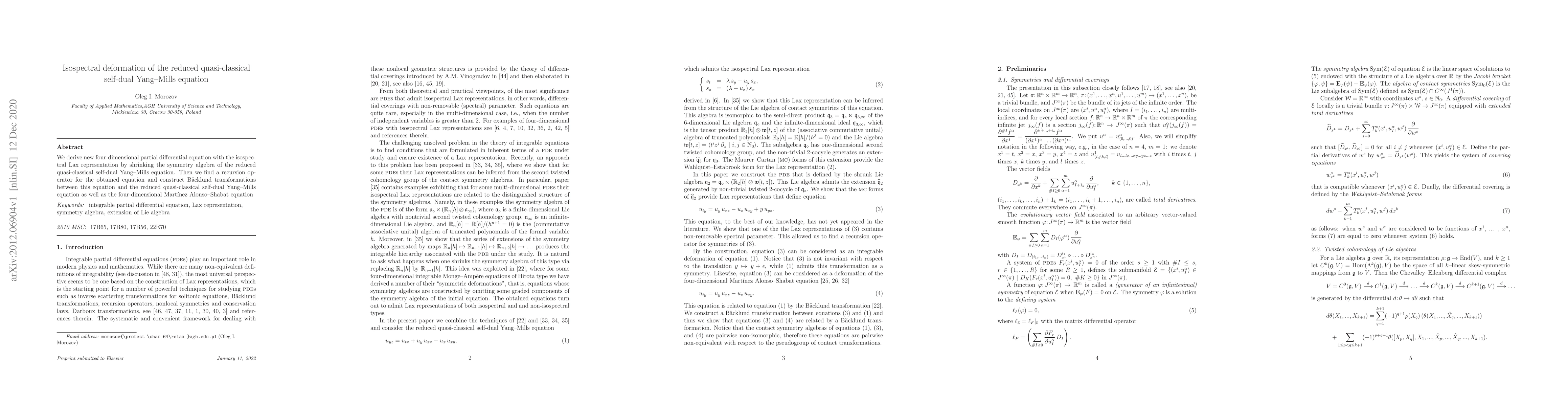 We derive new four-dimensional partial differential equation with the isospectral Lax representation by shrinking the symmetry algebra of the reduced quasi-classical self-dual Yang--Mills equation. Then we find a recursion operator for the obtained equation and construct B{\"a}cklund transformations between this equation and the reduced quasi-classical self-dual Yang--Mills equation as well as the four-dimensional Mart{\'{\i}}nez Alonso--Shabat equation