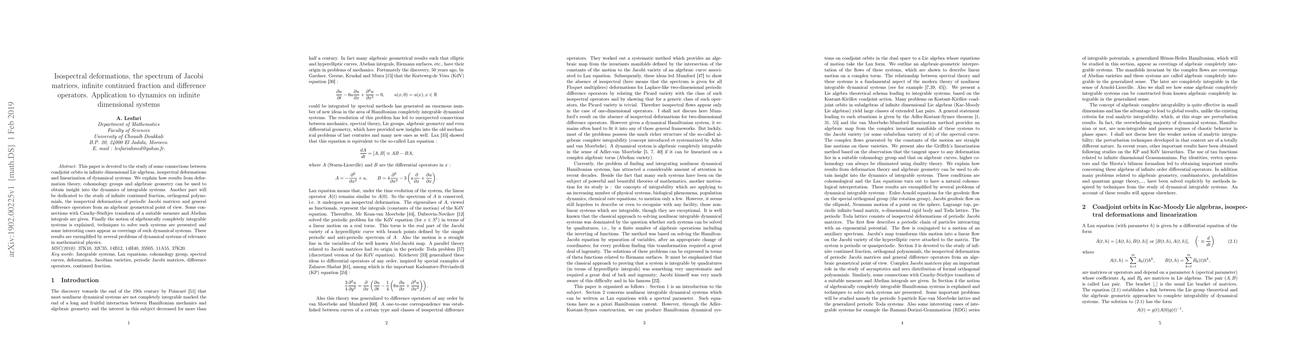 This paper explores connections between coadjoint orbits in infinite dimensional Lie algebras, isospectral deformations, and the dynamics of integrable systems, utilizing deformation theory, cohomology, and algebraic geometry. It also investigates infinite continued fractions, Jacobi matrices, and difference operators, linking them to algebraic geometry and Cauchy-Stieltjes transforms, and presents techniques for solving algebraically completely integrable systems with applications in mathematical physics.