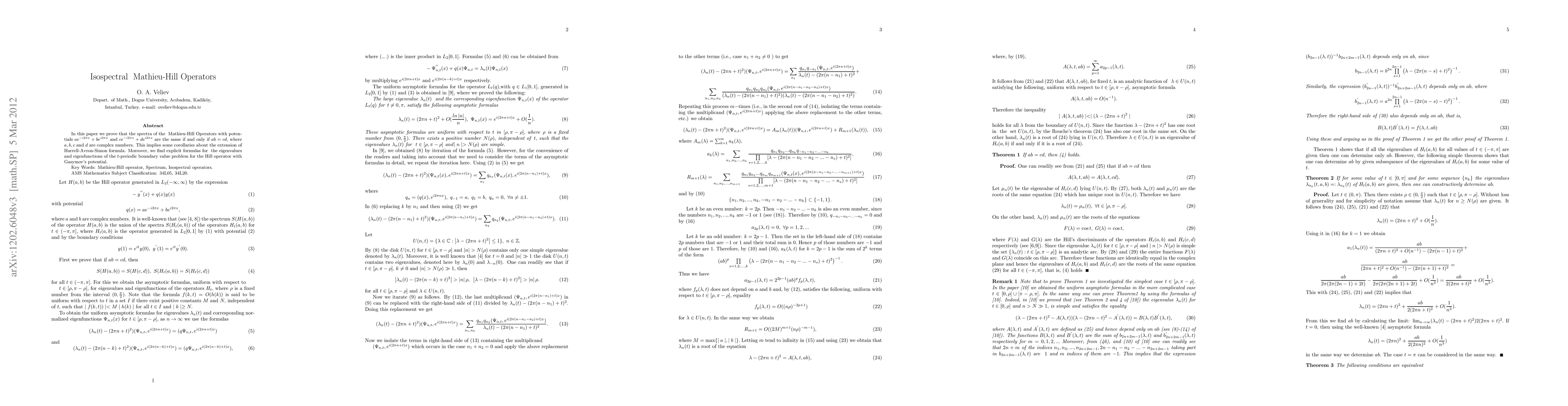 In this paper we prove that the spectrum of the Mathieu-Hill Operators with potentials ae^{-i2{\pi}x}+be^{i2{\pi}x} and ce^{-i2{\pi}x}+de^{i2{\pi}x} are the same if and only if ab=cd, where a,b,c and d are complex numbers. This result implies some corollaries about the extension of Harrell-Avron-Simon formula. Moreover, we find explicit formulas for the eigenvalues and eigenfunctions of the t-periodic boundary value problem for the Hill operator with Gasymov's potential.