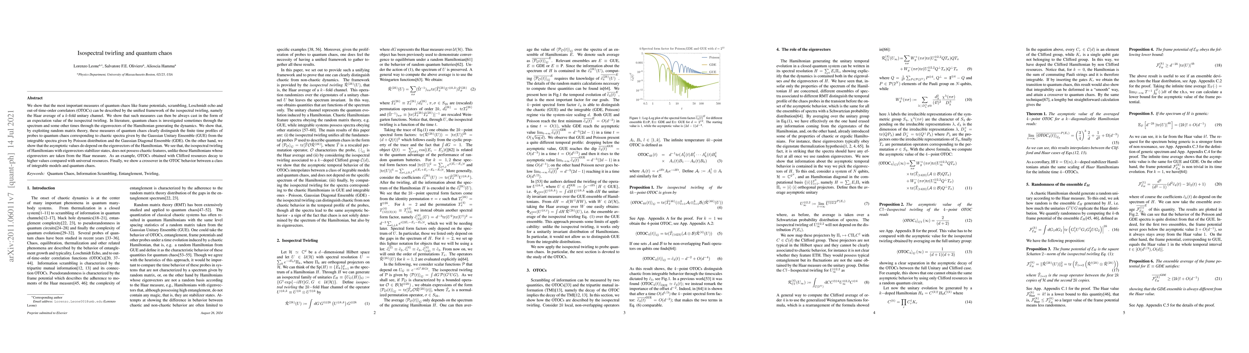This paper demonstrates that quantum chaos measures, such as scrambling and OTOCs, can be framed within the isospectral twirling approach, which averages unitary channels. It reveals that these measures distinguish chaotic from integrable systems using random matrix theory, but asymptotic values depend on Hamiltonian eigenvectors, showing that stabilizer states lack chaotic features.