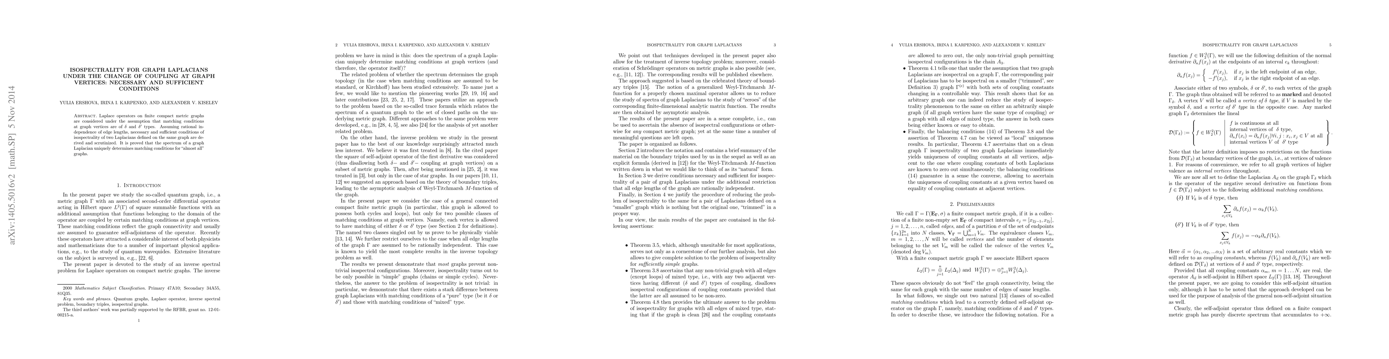 This research derives necessary and sufficient conditions for isospectrality of graph Laplacians under changes in vertex coupling types, proving that the spectrum uniquely determines matching conditions for most graphs, assuming rational independence of edge lengths.