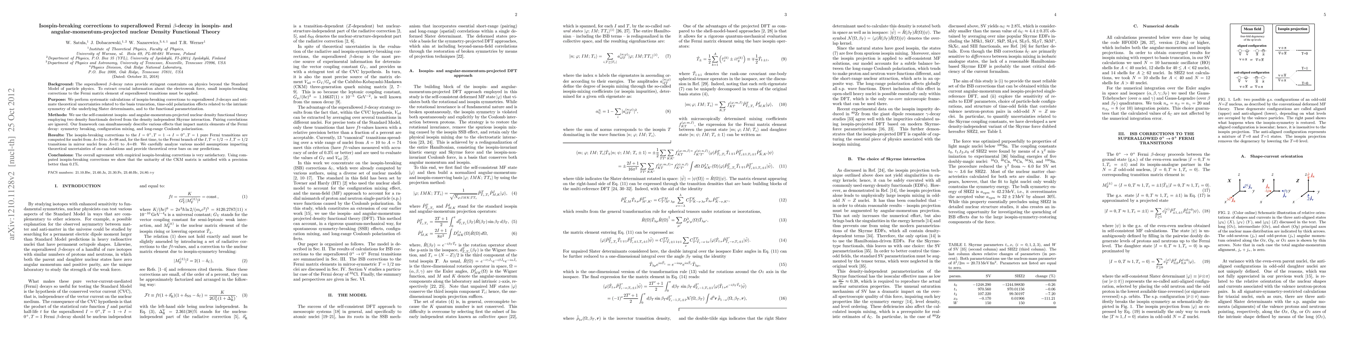 This paper systematically calculates isospin-breaking corrections for superallowed Fermi beta-decays using isospin- and angular-momentum-projected nuclear Density Functional Theory, finding satisfactory agreement with empirical data and demonstrating high precision in the unitarity of the CKM matrix. Theoretical uncertainties from basis truncation and functional parametrization are carefully analyzed and quantified.