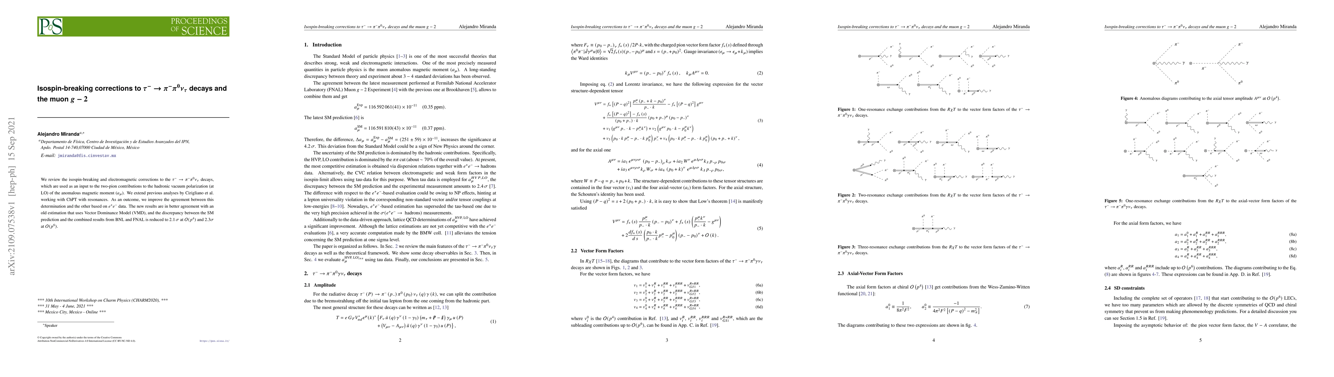 We review the isospin-breaking and electromagnetic corrections to the $\tau^- \to \pi^- \pi^0 \nu_\tau$ decays, which are used as an input to the two-pion contributions to the hadronic vacuum polarization (at LO) of the anomalous magnetic moment ($a_\mu$). We extend previous analyses by Cirigliano et al. working with ChPT with resonances. As an outcome, we improve the agreement between this determination and the other based on $e^+e^-$ data. The new results are in better agreement with an old estimation that uses Vector Dominance Model (VMD), and the discrepancy between the SM prediction and the combined results from BNL and FNAL is reduced to $2.1\,\sigma$ at $\mathcal{O}(p^4)$ and $2.3\sigma$ at $\mathcal{O}(p^6)$.