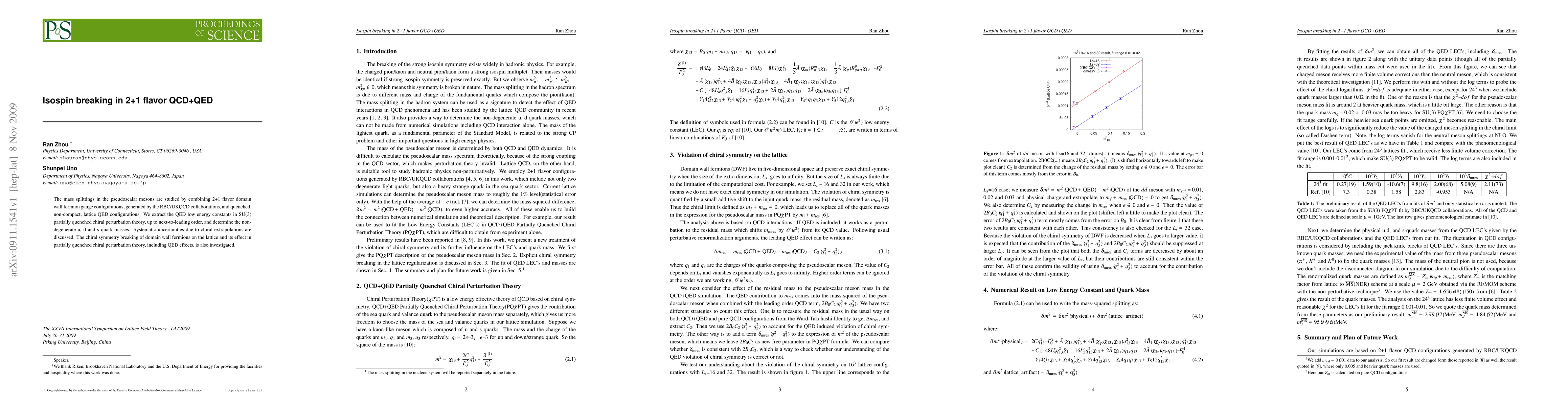 This paper investigates the mass splittings in pseudoscalar mesons using 2+1 flavor QCD+QED lattice simulations, extracting QED low energy constants and determining quark masses. It examines the effects of chiral symmetry breaking and systematic uncertainties in the context of partially quenched chiral perturbation theory.