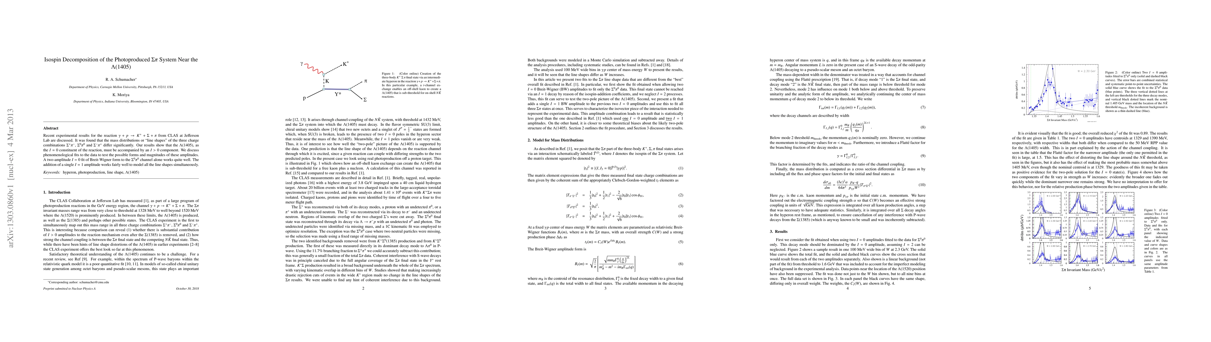 Recent experimental results for the reaction \gamma + p \to K^+ + \Sigma + \pi\ from CLAS at Jefferson Lab are discussed. It was found that the mass distributions or "line shapes" of the three charge combinations \Sigma^+ \pi^-, \Sigma^0 \pi^0 and \Sigma^- \pi^+ differ significantly. Our results show that the \Lambda(1405), as the I=0 constituent of the reaction, must be accompanied by an I > 0 component. We discuss phenomenological fits to the data to test the possible forms and magnitudes of these amplitudes. A two-amplitude I=0 fit of Breit-Wigner form to the \Sigma^0\pi^0 channel alone works quite well. The addition of a single I=1 amplitude works fairly well to model all the line shapes simultaneously.