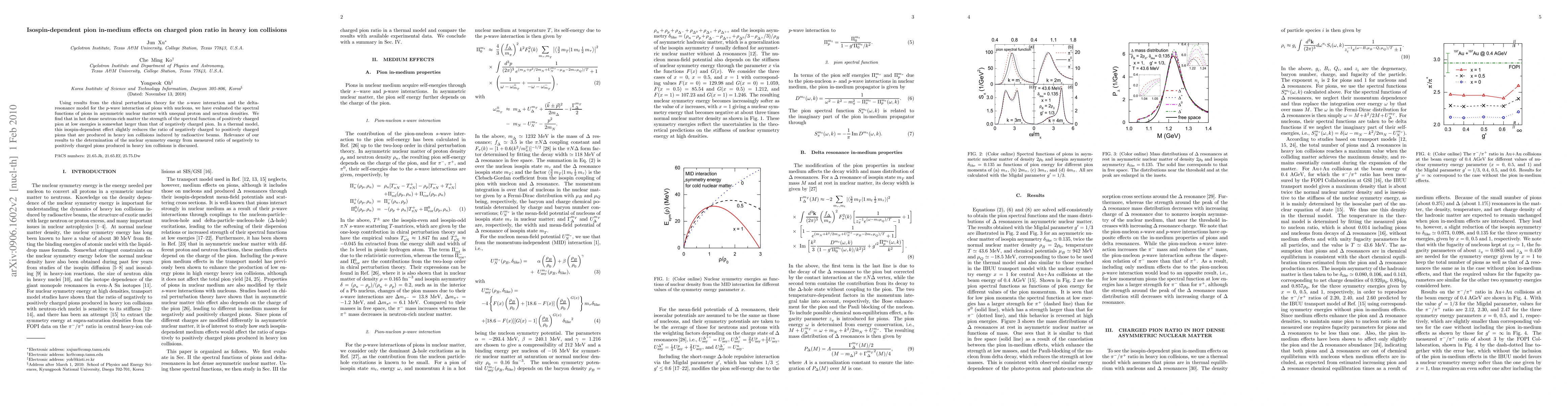 This study investigates the isospin-dependent effects of pions in asymmetric nuclear matter using chiral perturbation theory and the delta-resonance model, revealing that the spectral function of positively charged pions is stronger than that of negatively charged pions in neutron-rich environments. This effect slightly reduces the ratio of negatively to positively charged pions in heavy ion collisions, which has implications for determining the nuclear symmetry energy.
