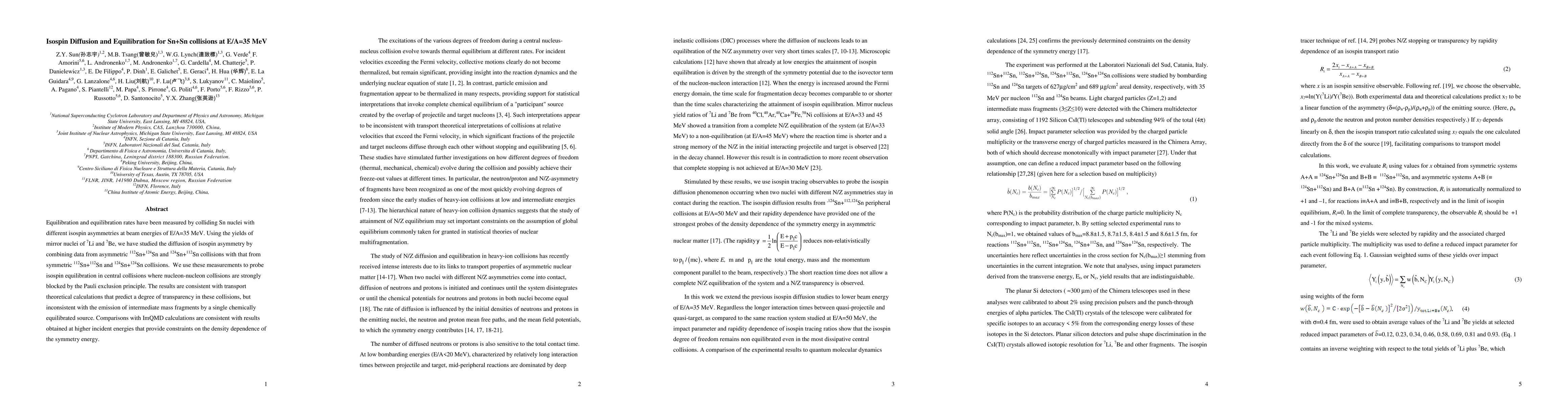 Equilibration and equilibration rates have been measured by colliding Sn nuclei with different isospin asymmetries at beam energies of E/A=35 MeV. Using the yields of mirror nuclei of 7Li and 7Be, we have studied the diffusion of isospin asymmetry by combining data from asymmetric 112Sn+124Sn and 124Sn+112Sn collisions with that from symmetric 112Sn+112Sn and 124Sn+124Sn collisions. We use these measurements to probe isospin equilibration in central collisions where nucleon-nucleon collisions are strongly blocked by the Pauli exclusion principal. The results are consistent with transport theoretical calculations that predict a degree of transparency in these collisions, but inconsistent with the emission of intermediate mass fragments by a single chemically equilibrated source. Comparisons with ImQMD calculations are consistent with results obtained at higher incident energies that provide constraints on the density dependence of the symmetry energy.