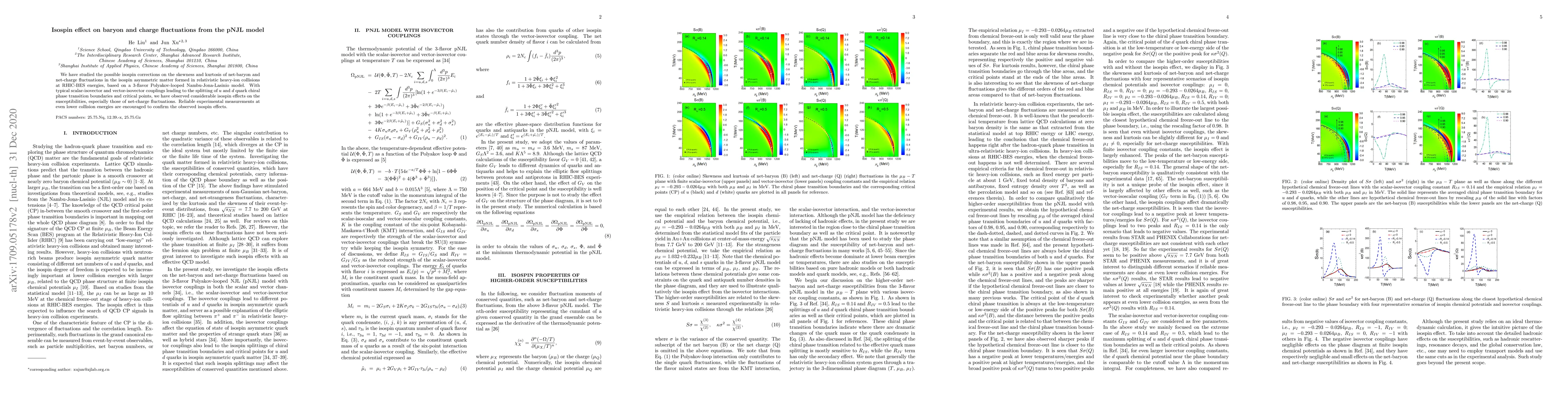 We have studied the possible isospin corrections on the skewness and kurtosis of net-baryon and net-charge fluctuations in the isospin asymmetric matter formed in relativistic heavy-ion collisions at RHIC-BES energies, based on a 3-flavor polyakov-looped Nambu-Jona-Lasinio model. With typical scalar-isovector and vector-isovector couplings leading to the splitting of $u$ and $d$ quark chiral phase transition boundaries and critical points, we have observed dramatic isospin effects on the susceptibilities, especially those of net-charge fluctuations. Reliable experimental measurements at even lower collision energies are encouraged to confirm the observed isospin effects.