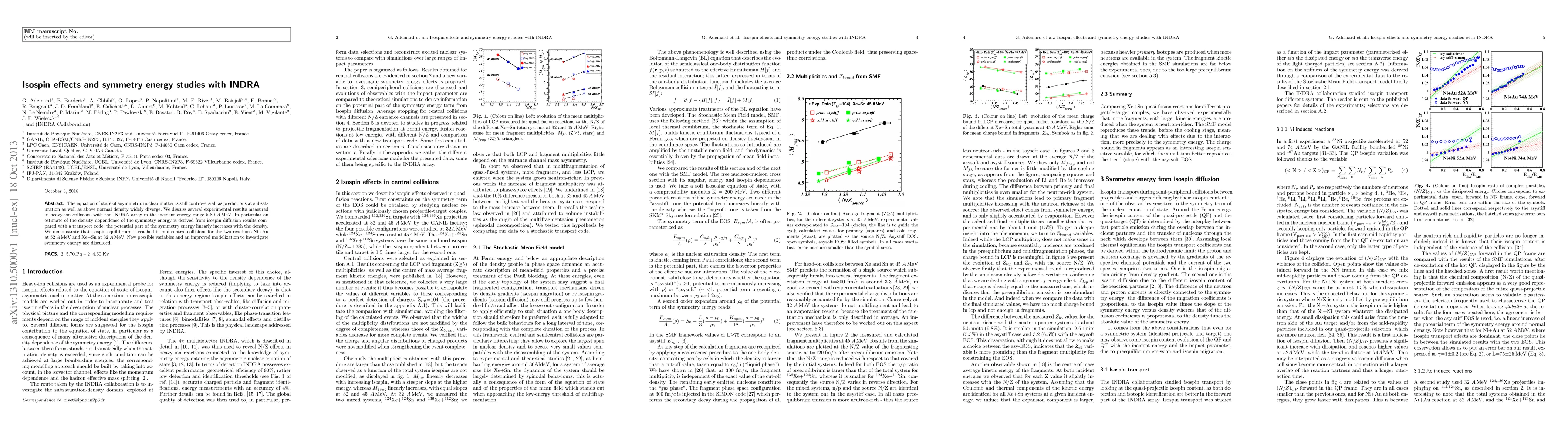The equation of state of asymmetric nuclear matter is still controversial, as predictions at subsaturation as well as above normal density widely diverge. We discuss several experimental results measured in heavy-ion collisions with the INDRA array in the incident energy range 5-80 MeV/nucleon. In particular an estimate of the density dependence of the symmetry energy is derived from isospin diffusion results compared with a transport code: the potential part of the symmetry energy linearly increases with the density. We demonstrate that isospin equilibrium is reached in mid-central collisions for the two reactions Ni+Au at 52 MeV/nucleon and Xe+Sn at 32 MeV/nucleon. New possible variables and an improved modelization to investigate symmetry energy are discussed.