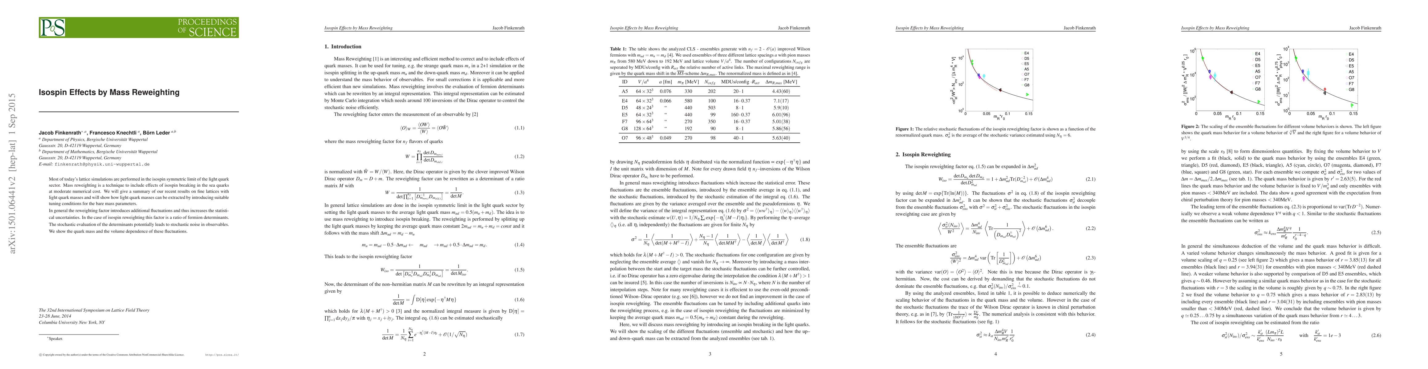 The paper presents a detailed analysis of isospin effects by mass reweighting, including the derivation of the isospin reweighting factor, the scaling of fluctuations, and the extraction of light quark masses.