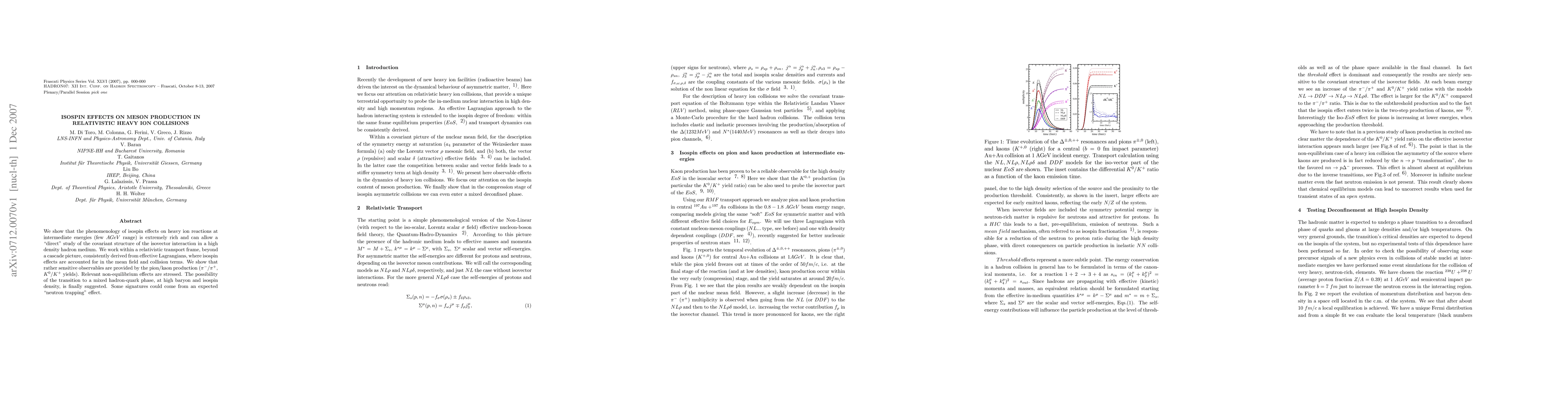 We show that the phenomenology of isospin effects on heavy ion reactions at intermediate energies (few AGeV range) is extremely rich and can allow a ``direct'' study of the covariant structure of the isovector interaction in a high density hadron medium. We work within a relativistic transport frame, beyond a cascade picture, consistently derived from effective Lagrangians, where isospin effects are accounted for in the mean field and collision terms. We show that rather sensitive observables are provided by the pion/kaon production (\pi^-/\pi^+, K^0/K^+ yields). Relevant non-equilibrium effects are stressed. The possibility of the transition to a mixed hadron-quark phase, at high baryon and isospin density, is finally suggested. Some signatures could come from an expected ``neutron trapping'' effect.