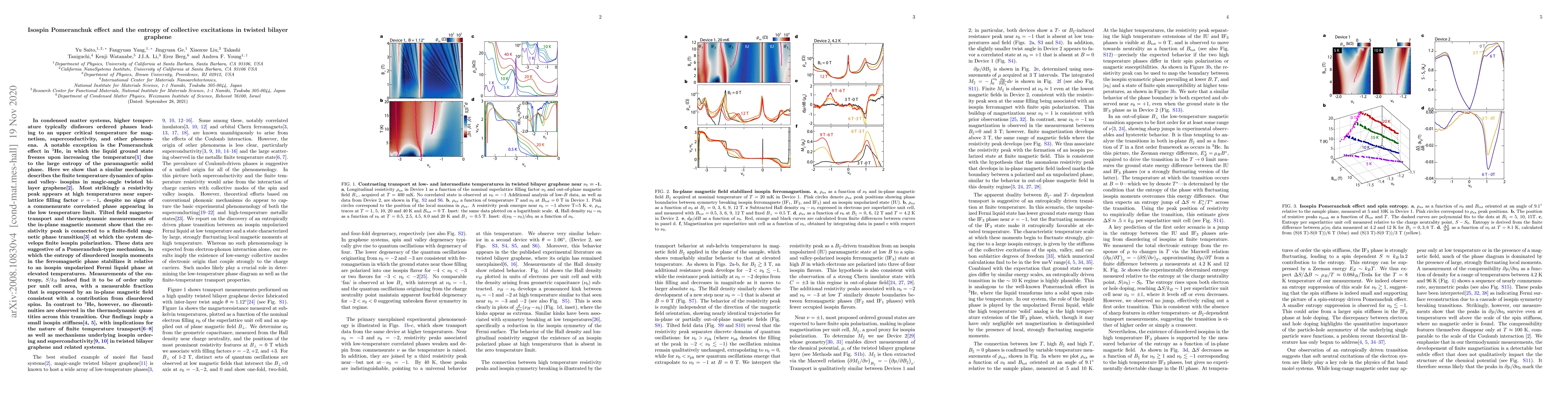In condensed matter systems, higher temperatures typically disfavors ordered phases leading to an upper critical temperature for magnetism, superconductivity, and other phenomena. A notable exception is the Pomeranchuk effect in 3He, in which the liquid ground state freezes upon increasing the temperature due to the large entropy of the paramagnetic solid phase. Here we show that a similar mechanism describes the finite temperature dynamics of spin and valley-isospins in magic-angle twisted bilayer graphene. Most strikingly a resistivity peak appears at high temperatures near superlattice filling factor nu = -1, despite no signs of a commensurate correlated phase appearing in the low-temperature limit. Tilted field magnetotransport and thermodynamic measurements of the inplane magnetic moment show that the resistivity peak is adiabatically connected to a finite-field magnetic phase transition at which the system develops finite isospin polarization. These data are suggestive of a Pomeranchuk-type mechanism, in which the entropy of disordered isospin moments in the ferromagnetic phase stabilizes it relative to an isospin unpolarized Fermi liquid phase at elevated temperatures. Measurements of the entropy, S/kB indeed find it to be of order unity per unit cell area, with a measurable fraction that is suppressed by an in-plane magnetic field consistent with a contribution from disordered physical spins. In contrast to 3He, however, no discontinuities are observed in the thermodynamic quantities across this transition. Our findings imply a small isospin stiffness, with implications for the nature of finite temperature transport as well as the mechanisms underlying isospin ordering and superconductivity in twisted bilayer graphene and related systems.