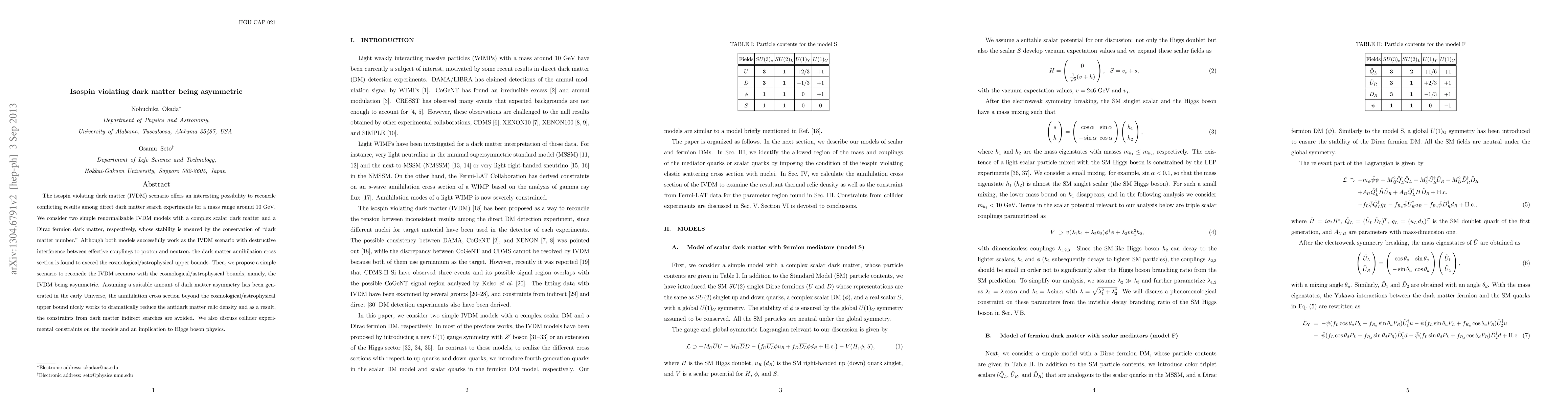 The isospin violating dark matter (IVDM) scenario offers an interesting possibility to reconcile conflicting results among direct dark matter search experiments for a mass range around 10 GeV. We consider two simple renormalizable IVDM models with a complex scalar dark matter and a Dirac fermion dark matter, respectively, whose stability is ensured by the conservation of "dark matter number". Although both models successfully work as the IVDM scenario with destructive interference between effective couplings to proton and neutron, the dark matter annihilation cross section is found to exceed the cosmological/astrophysical upper bounds. Then, we propose a simple scenario to reconcile the IVDM scenario with the cosmological/astrophysical bounds, namely, the IVDM being asymmetric. Assuming a suitable amount of dark matter asymmetry has been generated in the early Universe, the annihilation cross section beyond the cosmological/astrophysical upper bound nicely works to dramatically reduce the anti-dark matter relic density and as a result, the constraints from dark matter indirect searches are avoided. We also discuss collider experimental constraints on the models and an implication to Higgs boson physics.