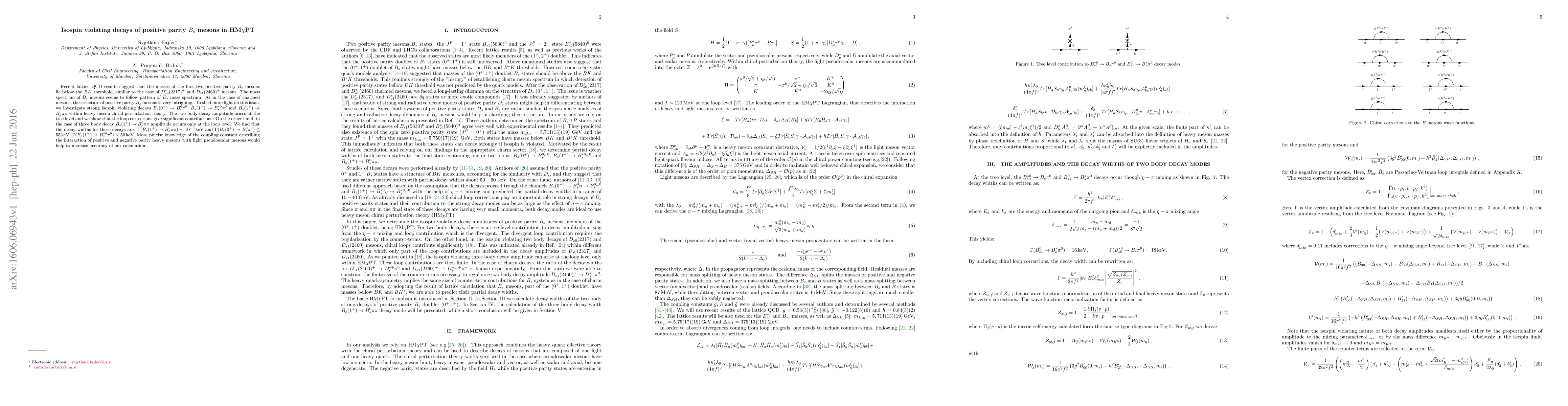 Recent lattice QCD results suggest that the masses of the first two positive parity $B_s$ mesons lie below the BK threshold, similar to the case of $D^*_{s0}(2317)^+$ and $D_{s1}(2460)^+$ mesons. The mass spectrum of $B_s$ mesons seems to follow pattern of $D_s$ mass spectrum. As in the case of charmed mesons, the structure of positive parity $B_s$ mesons is very intriguing. To shed more light on this issue, we investigate strong isospin violating decays $B_s(0^+) \to B_s^0 \pi^0$, $B_s(1^+) \to B_s^{*0} \pi^0$ and $B_s(1^+) \to B_s^0 \pi \pi$ within heavy meson chiral perturbation theory. The two body decay amplitude arises at the tree level and we show that the loop corrections give significant contributions. On the other hand, in the case of three body decay $B_s(1^+) \to B_s^0 \pi \pi$ amplitude occurs only at the loop level. We find that the decay widths for these decays are: $\Gamma (B_s(1^+) \to B_s^0 \pi \pi)\sim 10^{-3}\,$keV and $\Gamma (B_s(0^+) \to B_s^0 \pi^0) \leq 55\,$keV, $\Gamma (B_s(1^+) \to B_s^{*0} \pi^0) \leq 50\,$keV. More precise knowledge of the coupling constant describing the interaction of positive and negative parity heavy mesons with light pseudoscalar mesons would help to increase accuracy of our calculation.