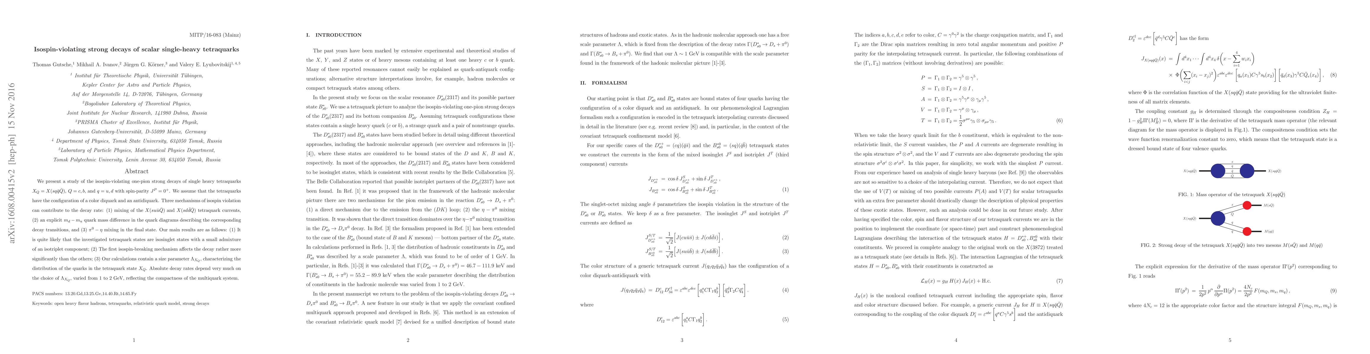 We present a study of the isospin-violating one-pion strong decays of single heavy tetraquarks $X_Q = X(s q \bar q \bar Q)$, $Q=c, b$, and $q=u, d$ with spin-parity $J^P = 0^+$. We assume that the tetraquarks have the configuration of a color diquark and a antidiquark. Three mechanisms of isospin violation can contribute to the decay rate: (1) mixing of the $X(s u \bar u \bar Q)$ and $X(s d \bar d \bar Q)$ tetraquark currents, (2) an explicit $m_d-m_u$ quark mass difference in the quark diagrams describing the corresponding decay transitions and (3) $\pi^0-\eta$ mixing in the final state. Our main results are: (1) It is quite likely that the investigated tetraquark states are isosinglet states with a small admixture of an isotriplet component; (2) The first isospin-breaking mechanism affects the decay rater more significantly than the others; (3) Our calculations contain a size parameter $\Lambda_{X_Q}$, characterizing the distribution of the quarks in the tetraquark state $X_Q$. Absolute decay rates depend very much on the choice of $\Lambda_{X_Q}$, varied from 1 to 2 GeV, reflecting the compactness of the multiquark system.