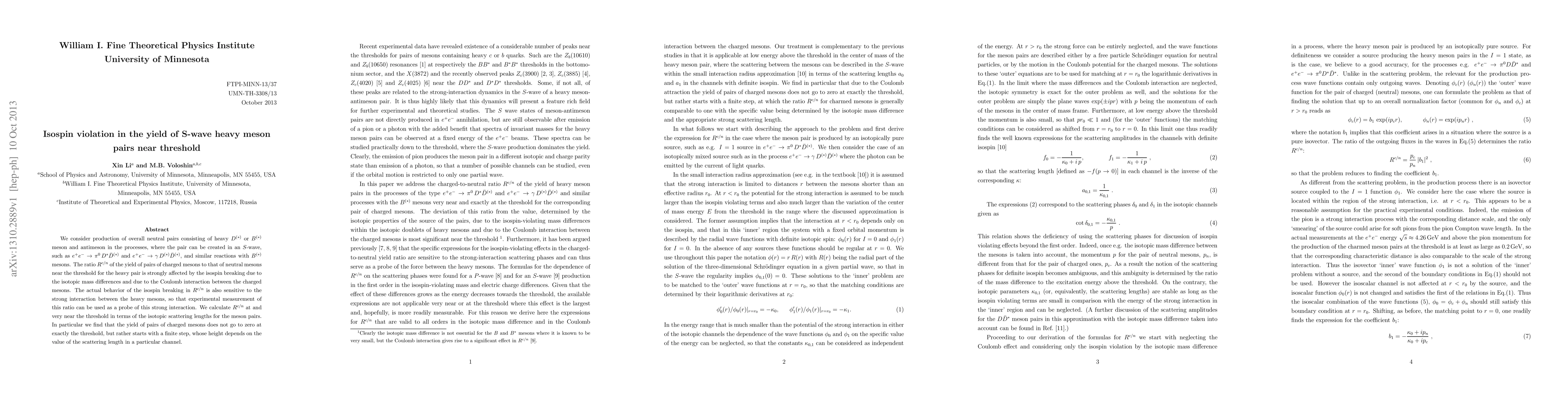 This paper investigates the isospin violation in the production of neutral pairs of heavy $D^{(*)}$ or $B^{(*)}$ mesons in $S$-wave processes, finding that the ratio of charged to neutral meson pairs near threshold is significantly influenced by isospin breaking and the strong interaction between the mesons. The study reveals that the yield of charged meson pairs does not vanish at the exact threshold but begins with a finite step, dependent on the scattering length.