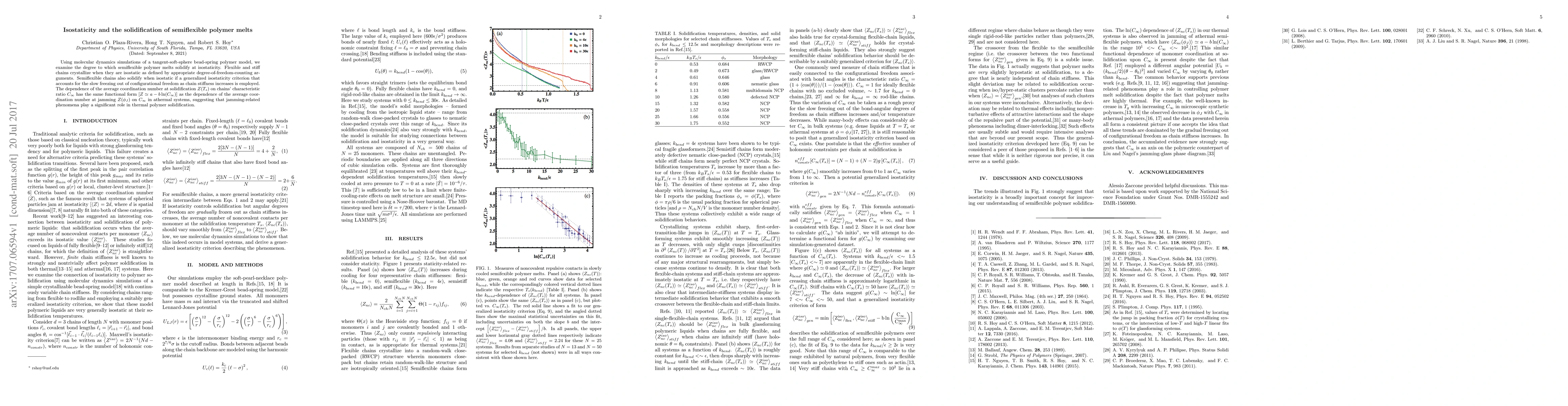Summary: Molecular dynamics simulations reveal that semiflexible polymer melts solidify at isostaticity, akin to flexible and stiff chains, under a generalized isostaticity criterion. The relationship between the average coordination number at solidification and polymer stiffness indicates that jamming-related phenomena significantly influence polymer solidification.
