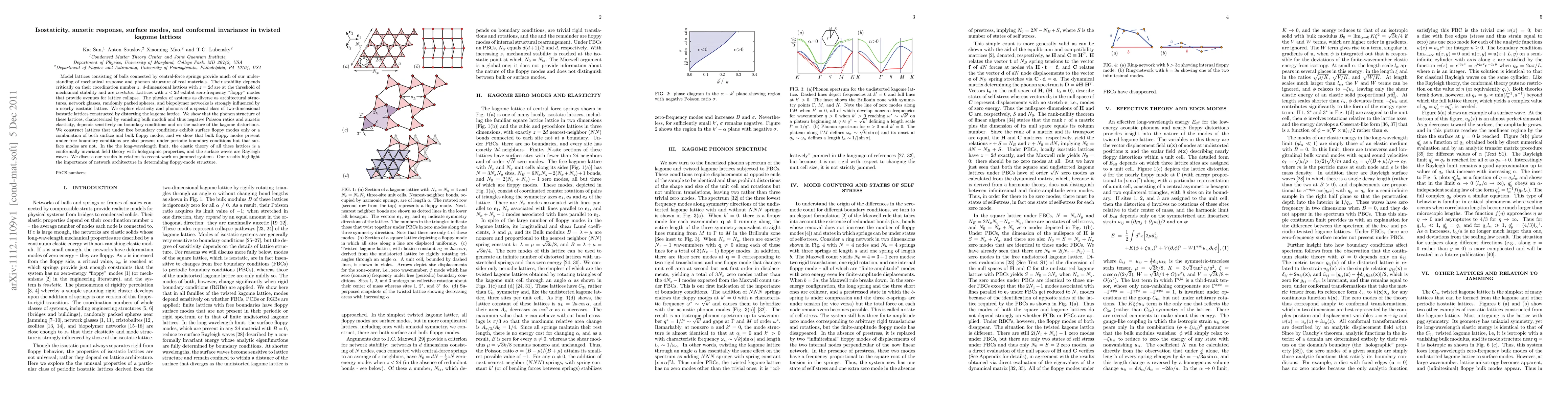 Model lattices consisting of balls connected by central-force springs provide much of our understanding of mechanical response and phonon structure of real materials. Their stability depends critically on their coordination number $z$. $d$-dimensional lattices with $z=2d$ are at the threshold of mechanical stability and are isostatic. Lattices with $z<2d$ exhibit zero-frequency "floppy" modes that provide avenues for lattice collapse. The physics of systems as diverse as architectural structures, network glasses, randomly packed spheres, and biopolymer networks is strongly influenced by a nearby isostatic lattice. We explore elasticity and phonons of a special class of two-dimensional isostatic lattices constructed by distorting the kagome lattice. We show that the phonon structure of these lattices, characterized by vanishing bulk moduli and thus negative Poisson ratios and auxetic elasticity, depends sensitively on boundary conditions and on the nature of the kagome distortions. We construct lattices that under free boundary conditions exhibit surface floppy modes only or a combination of both surface and bulk floppy modes; and we show that bulk floppy modes present under free boundary conditions are also present under periodic boundary conditions but that surface modes are not. In the the long-wavelength limit, the elastic theory of all these lattices is a conformally invariant field theory with holographic properties, and the surface waves are Rayleigh waves. We discuss our results in relation to recent work on jammed systems. Our results highlight the importance of network architecture in determining floppy-mode structure.
