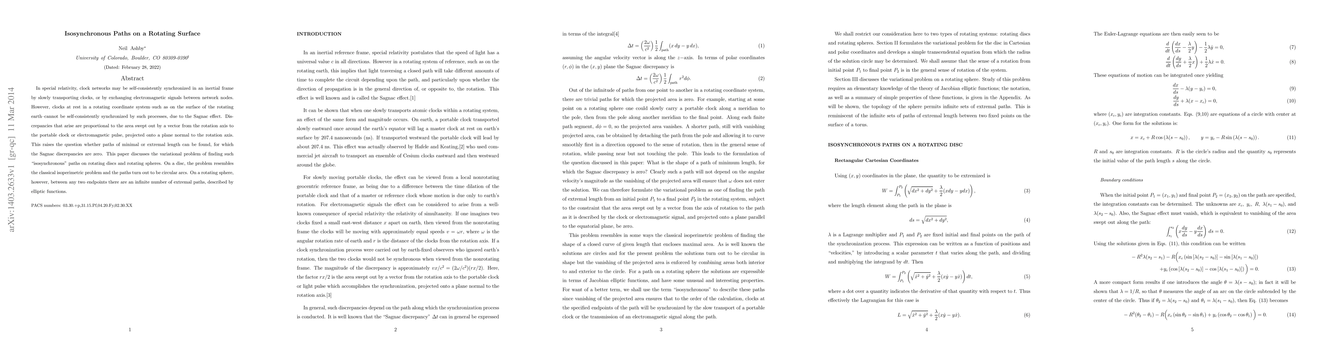 In special relativity, clock networks may be self-consistently synchronized in an inertial frame by slowly transporting clocks, or by exchanging electromagnetic signals between network nodes. However, clocks at rest in a rotating coordinate system--such as on the surface of the rotating earth--cannot be self-consistently synchronized by such processes, due to the Sagnac effect. Discrepancies that arise are proportional to the area swept out by a vector from the rotation axis to the portable clock or electromagnetic pulse, projected onto a plane normal to the rotation axis. This raises the question whether paths of minimal or extremal length can be found, for which the Sagnac discrepancies are zero. This paper discusses the variational problem of finding such "isosynchronous" paths on rotating discs and rotating spheres. On a disc, the problem resembles the classical isoperimetric problem and the paths turn out to be circular arcs. On a rotating sphere, however, between any two endpoints there are an infinite number of extremal paths, described by elliptic functions.
