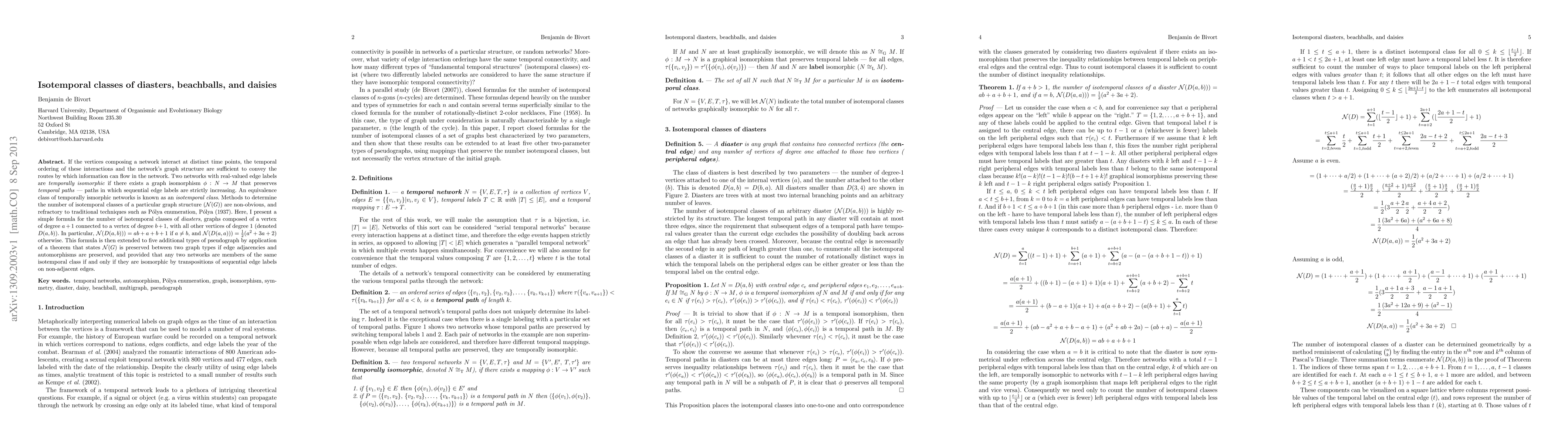 If the vertices composing a network interact at distinct time points, the temporal ordering of these interactions and the network's graph structure are sufficient to convey the routes by which information can flow in the network. Two networks with real-valued edge labels are temporally isomorphic if there exists a graph isomorphism f:N->M that preserves temporal paths - paths in which sequential edge labels are strictly increasing. An equivalence class of temporally ismorphic networks is known as an isotemporal class. Methods to determine the number of isotemporal classes of a particular graph structure N(G) are non-obvious, and refractory to traditional techniques such as P\'olya enumeration (P\'olya, 1937). Here, I present a simple formula for the number of isotemporal classes of diasters, graphs composed of a vertex of degree a+1 connected to a vertex of degree b+1, with all other vertices of degree 1 (denoted D(a,b)). In particular, N(D(a,b)))=ab+a+b+1 if a is not equal to b, and N(D(a,a)))=(1/2) (a^2+3a+2) otherwise. This formula is then extended to five additional types of pseudograph by application of a theorem that states N(G) is preserved between two graph types if edge adjacencies and automorphisms are preserved, and provided that any two networks are members of the same isotemporal class if and only if they are isomorphic by transpositions of sequential edge labels on non-adjacent edges.