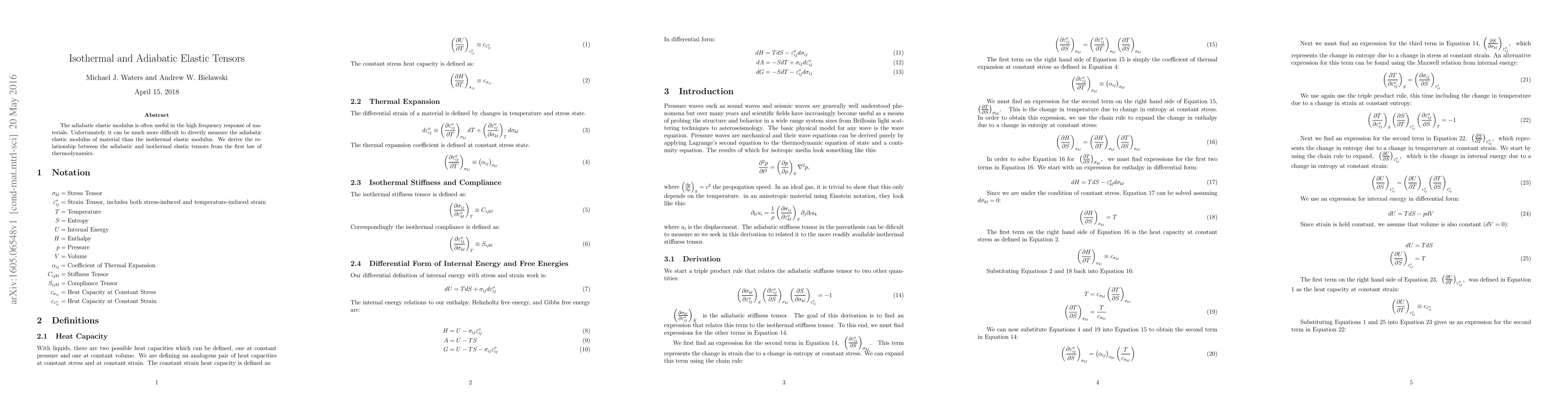 Researchers derived a relationship between adiabatic and isothermal elastic tensors from the first law of thermodynamics, enabling easier measurement of high-frequency material responses.