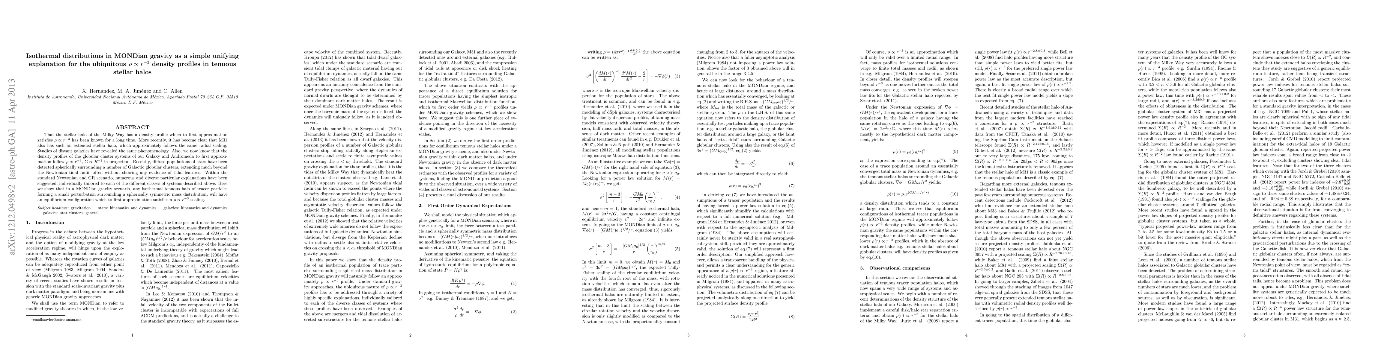 That the stellar halo of the Milky Way has a density profile which to first approximation satisfies $\rho \propto r^{-3}$ has been known for a long time. More recently, it has become clear that M31 also has such an extended stellar halo, which approximately follows the same radial scaling. Studies of distant galaxies have revealed the same phenomenology. Also, we now know that the density profiles of the globular cluster systems of our Galaxy and Andromeda to first approximation follow $\rho \propto r^{-3}$, $\Sigma \propto R^{-2}$ in projection. Recently, diffuse populations of stars have been detected spherically surrounding a number of Galactic globular clusters, extending much beyond the Newtonian tidal radii, often without showing any evidence of tidal features. Within the standard Newtonian and GR scenario, numerous and diverse particular explanations have been suggested, individually tailored to each of the different classes of systems described above. Here we show that in a MONDian gravity scenario, any isothermal tenuous halo of tracer particles forming a small perturbation surrounding a spherically symmetric mass distribution, will have an equilibrium configuration which to first approximation satisfies a $\rho \propto r^{-3}$ scaling.