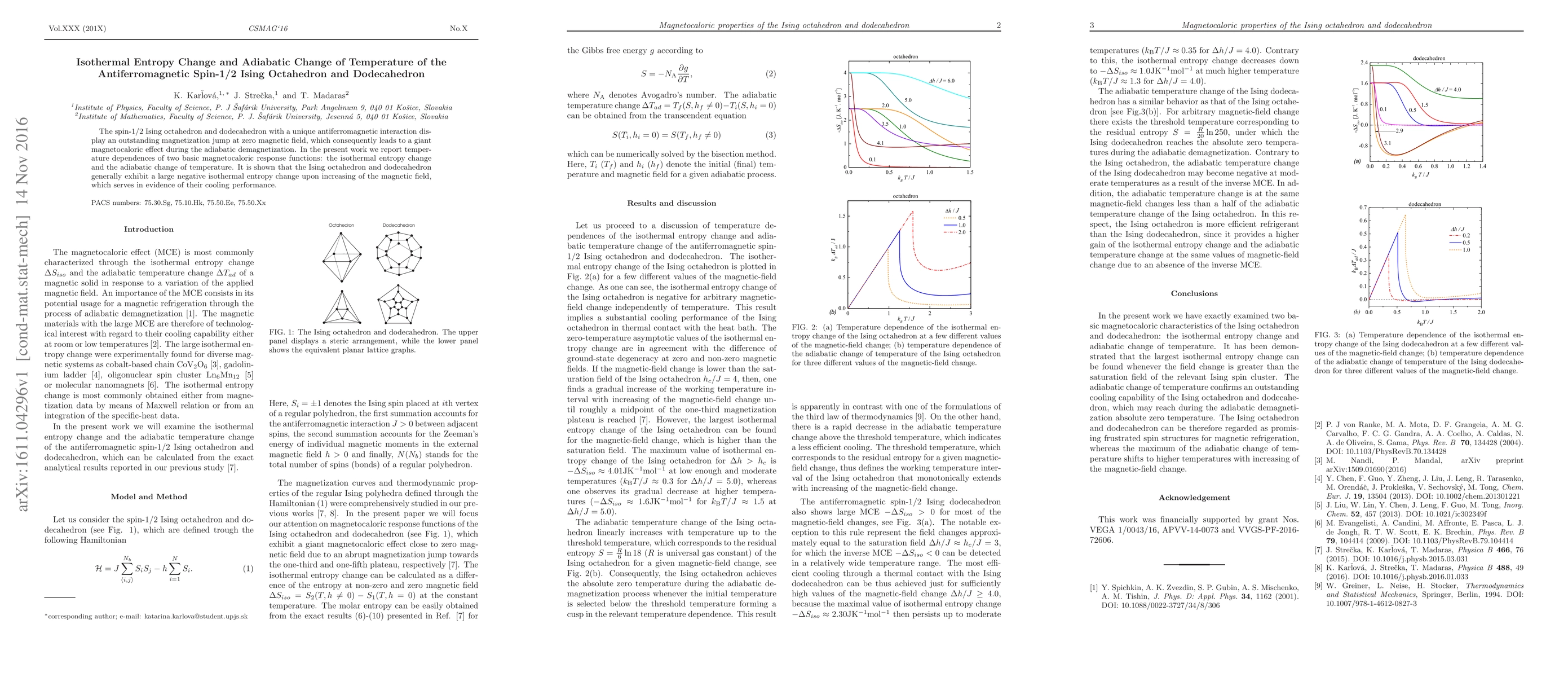 Summary: This study investigates the isothermal entropy change and adiabatic temperature change in antiferromagnetic spin-1/2 Ising octahedrons and dodecahedrons. The research reveals significant magnetization jumps and a giant magnetocaloric effect, demonstrating large negative isothermal entropy changes indicative of their cooling capabilities.
