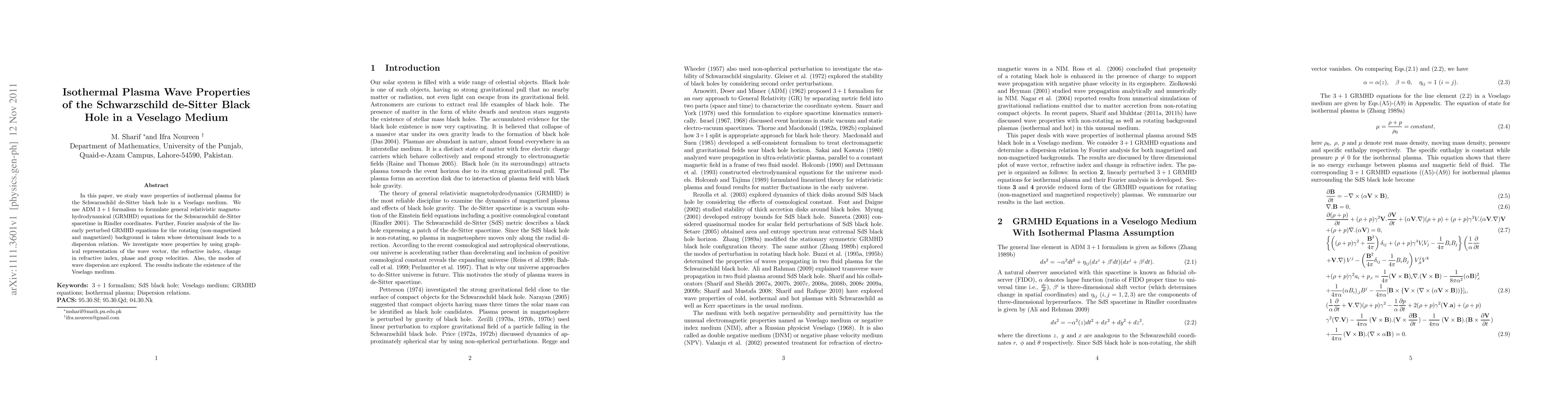 This paper investigates wave properties in isothermal plasma around a Schwarzschild de-Sitter black hole in a Veselago medium using the ADM 3+1 formalism and GRMHD equations. It derives a dispersion relation through Fourier analysis and explores wave vector, refractive index, and velocities, confirming the existence of the Veselago medium.