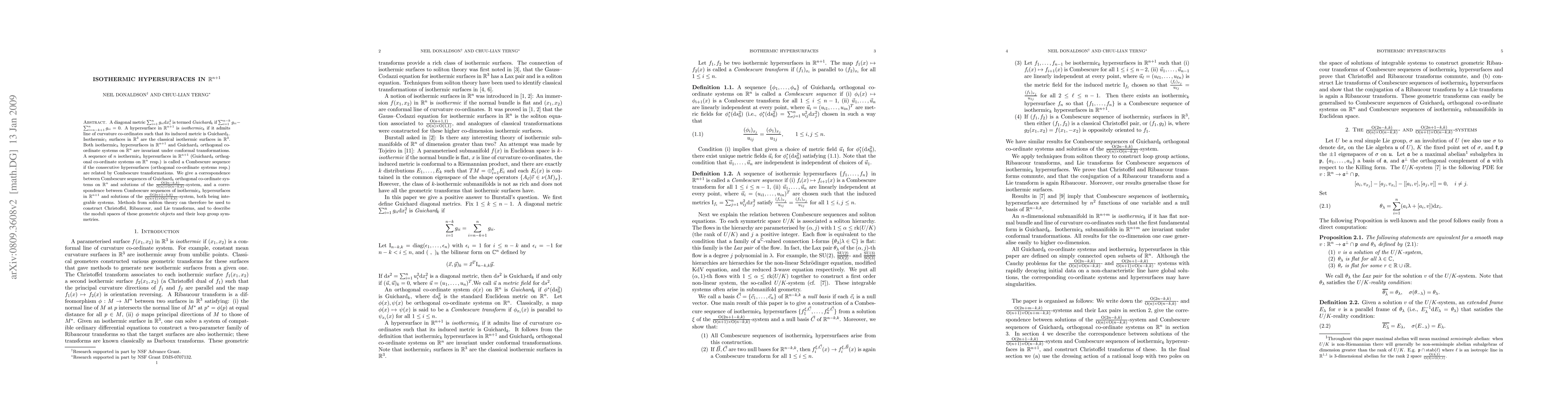 A diagonal metric sum_{i=1}^n g_{ii} dx_i^2 is termed Guichard_k if sum_{i=1}^{n-k}g_{ii}-sum_{i=n-k+1}^n g_{ii}=0. A hypersurface in R^{n+1} is isothermic_k if it admits line of curvature co-ordinates such that its induced metric is Guichard_k. Isothermic_1 surfaces in R^3 are the classical isothermic surfaces in R^3. Both isothermic_k hypersurfaces in R^{n+1} and Guichard_k orthogonal co-ordinate systems on R^n are invariant under conformal transformations. A sequence of n isothermic_k hypersurfaces in R^{n+1} (Guichard_k orthogonal co-ordinate systems on R^n resp.) is called a Combescure sequence if the consecutive hypersurfaces (orthogonal co-ordinate systems resp.) are related by Combescure transformations. We give a correspondence between Combescure sequences of Guichard_k orthogonal co-ordinate systems on R^n and solutions of the O(2n-k,k)/O(n)xO(n-k,k)-system, and a correspondence between Combescure sequences of isothermic_k hypersurfaces in R^{n+1} and solutions of the O(2n+1-k,k)/O(n+1)xO(n-k,k)-system, both being integrable systems. Methods from soliton theory can therefore be used to construct Christoffel, Ribaucour, and Lie transforms, and to describe the moduli spaces of these geometric objects and their loop group symmetries.