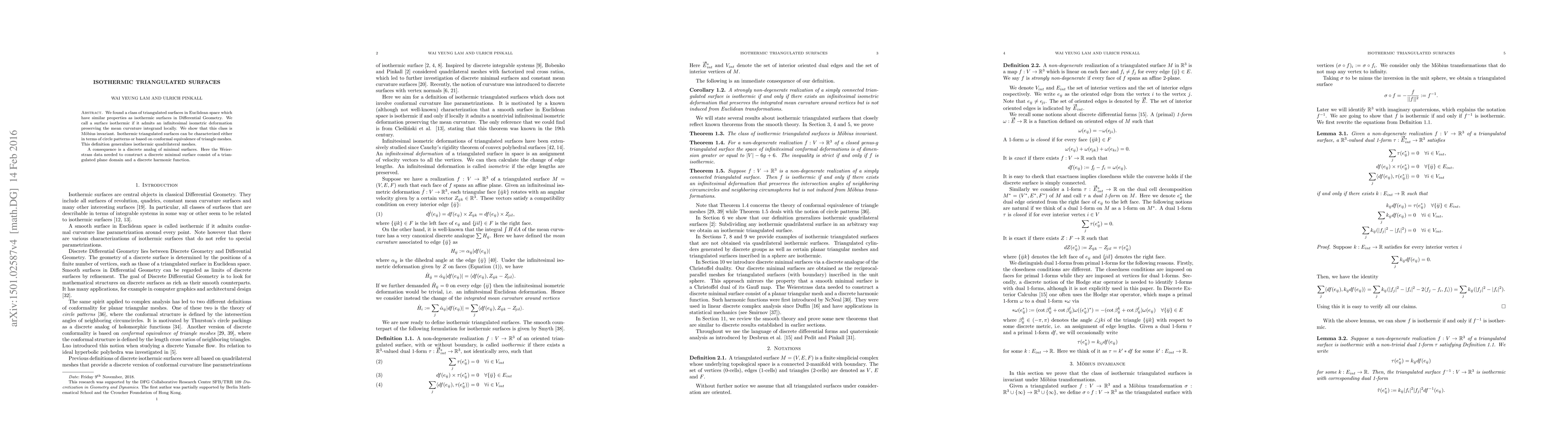 This paper introduces a class of triangulated surfaces in Euclidean space that exhibit properties similar to isothermic surfaces in differential geometry, characterized by an infinitesimal isometric deformation preserving mean curvature. The surfaces are shown to be Möbius invariant and can be defined via circle patterns or conformal equivalence of triangle meshes, generalizing isothermic quadrilateral meshes and providing a discrete analog of minimal surfaces.