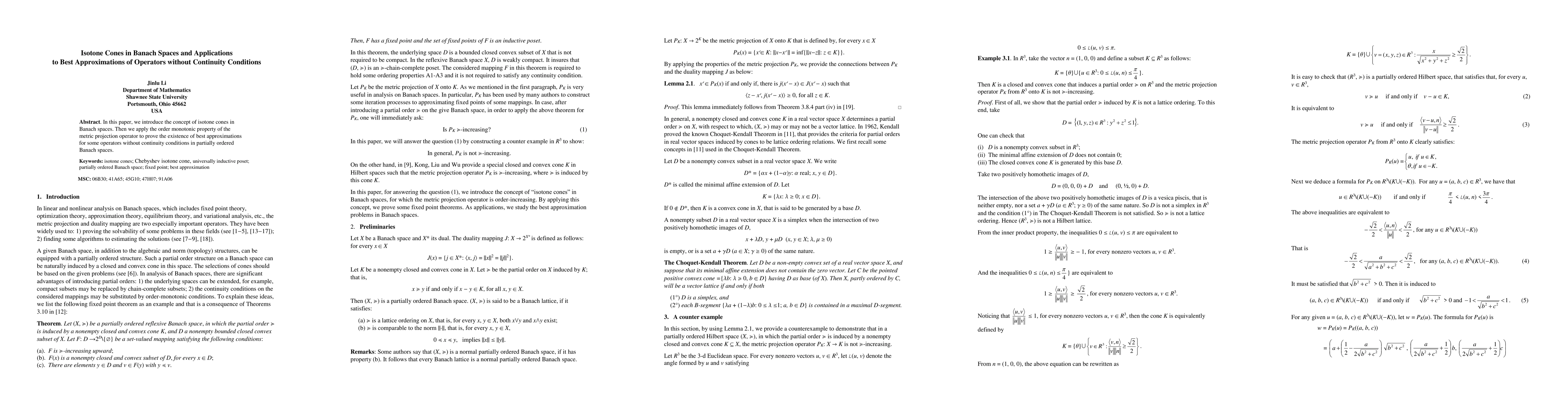 Summary: This paper introduces isotone cones in Banach spaces and leverages their order monotonic property to establish the existence of best approximations for certain operators, even in the absence of continuity conditions, within partially ordered Banach spaces.