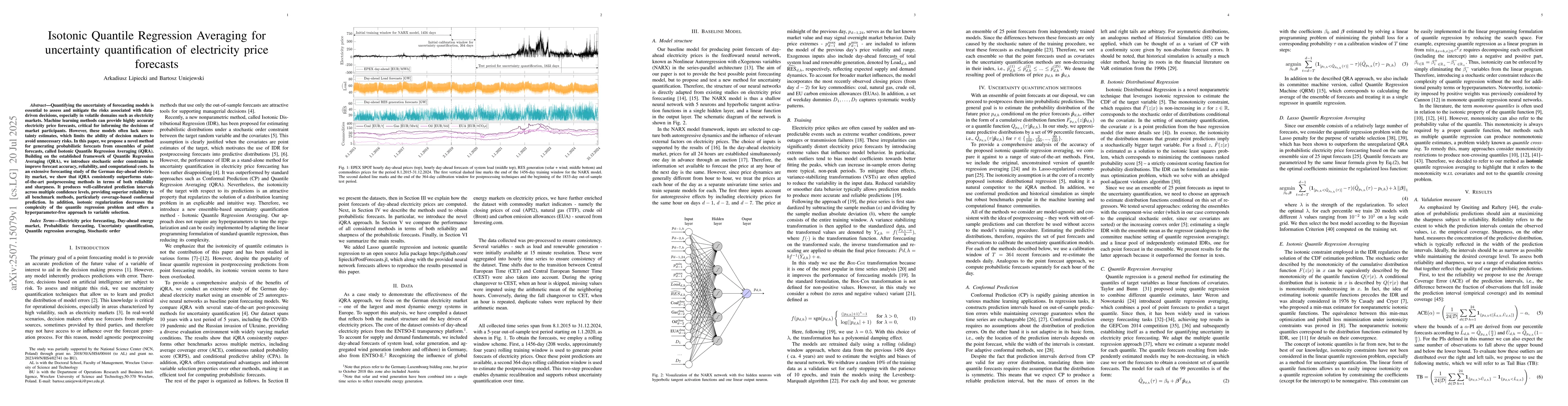 This research is significant as it addresses the critical need for uncertainty quantification in electricity price forecasts, which are essential for informing decisions in volatile markets. The proposed iQRA method enhances the estimation of predictive distributions in a computationally efficient and interpretable manner, bridging the gap between deterministic forecasts and risk assessment.