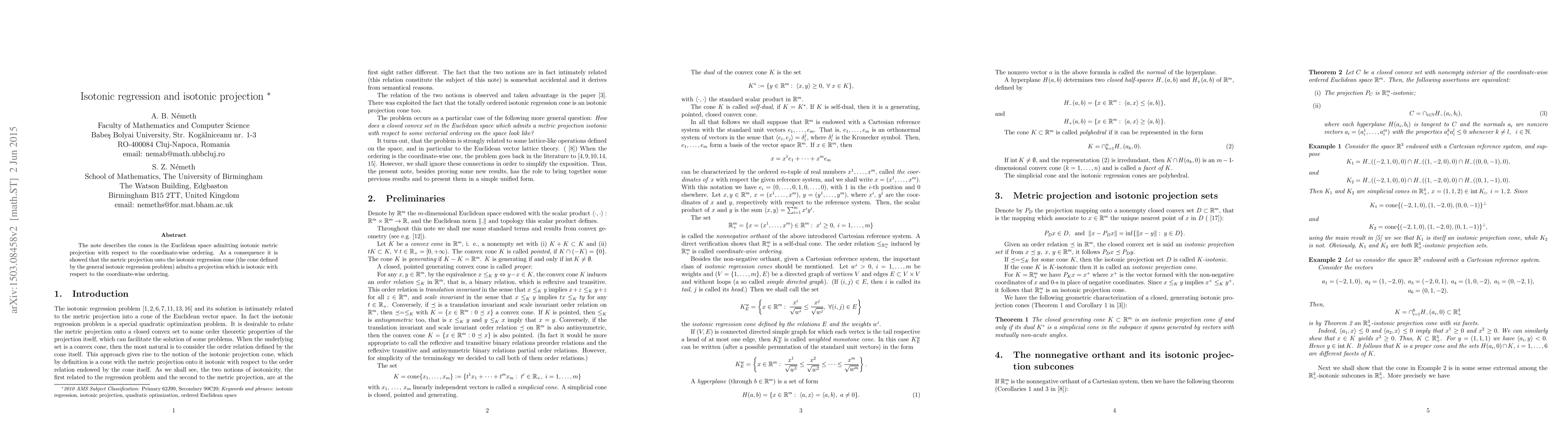 This paper explores cones in Euclidean space that allow isotonic metric projection under coordinate-wise ordering, demonstrating that the metric projection for the general isotonic regression problem is itself isotonic.