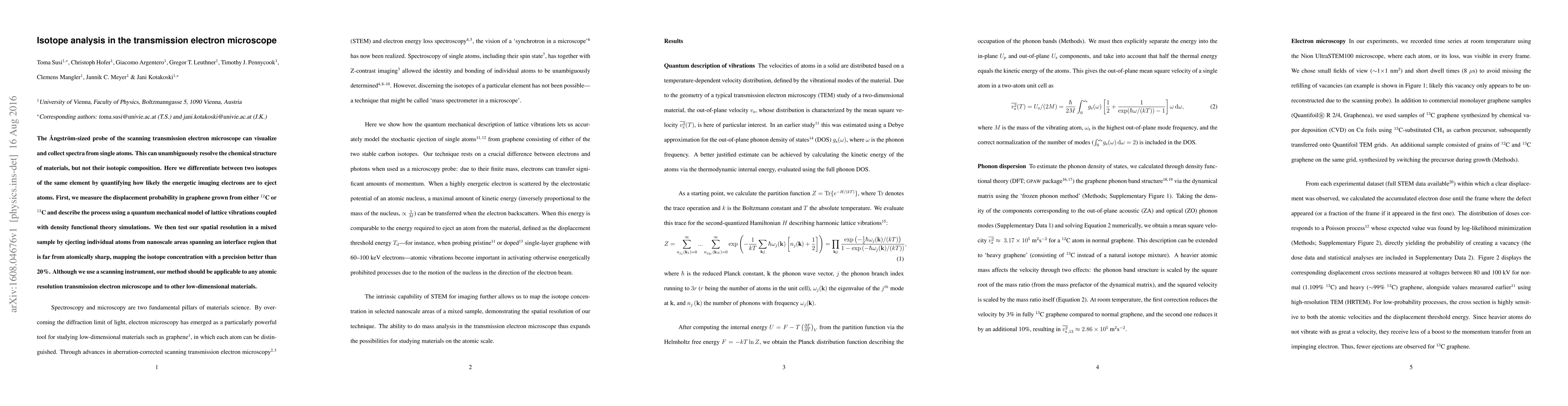 This paper presents a method for isotope analysis using a scanning transmission electron microscope, differentiating isotopes of the same element based on the probability of imaging electrons ejecting atoms. The technique is demonstrated in graphene samples and shows a spatial resolution better than 20% in mapping isotope concentration.