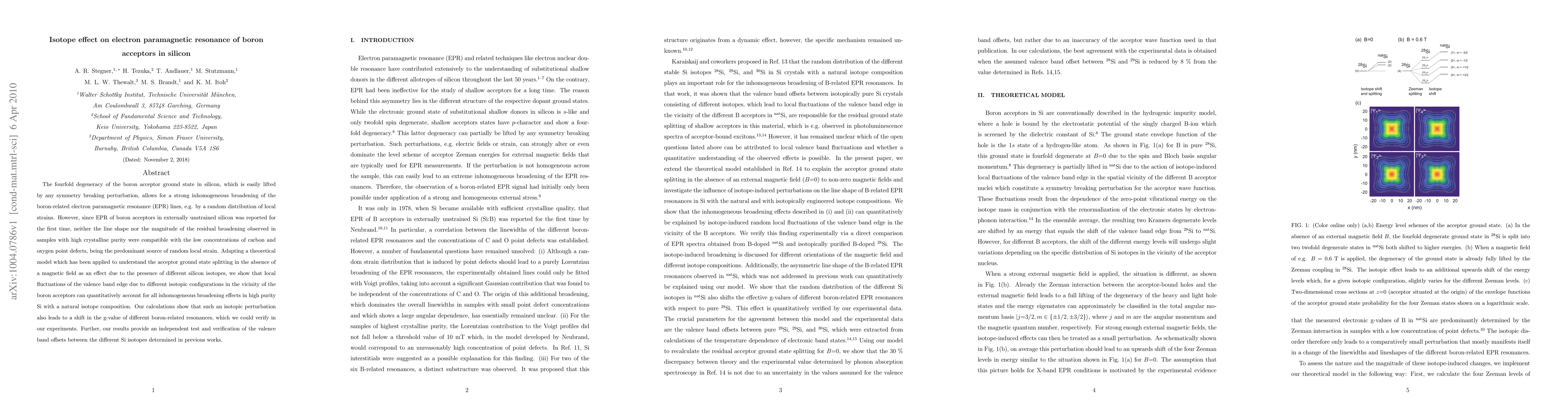 This study investigates the isotope effect on electron paramagnetic resonance (EPR) of boron acceptors in silicon, revealing that isotopic configurations cause significant inhomogeneous broadening, explaining discrepancies in observed EPR line shapes. The research confirms that isotopic perturbations lead to shifts in the g-value of boron-related resonances, providing validation for previous isotope-related valence band offset studies.