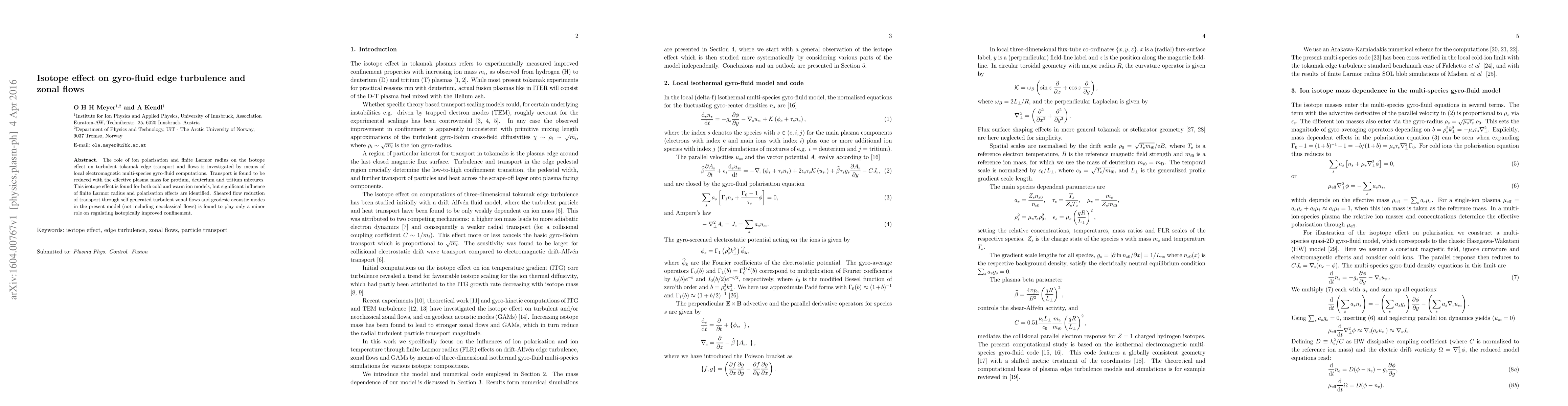 This study investigates the isotope effect on gyro-fluid edge turbulence in tokamak plasmas using local electromagnetic multi-species gyro-fluid computations. The research finds reduced transport with increased effective plasma mass for protium, deuterium, and tritium mixtures, with notable effects from finite Larmor radius and ion polarization, while sheared flows have a minor role in regulating isotopically improved confinement.