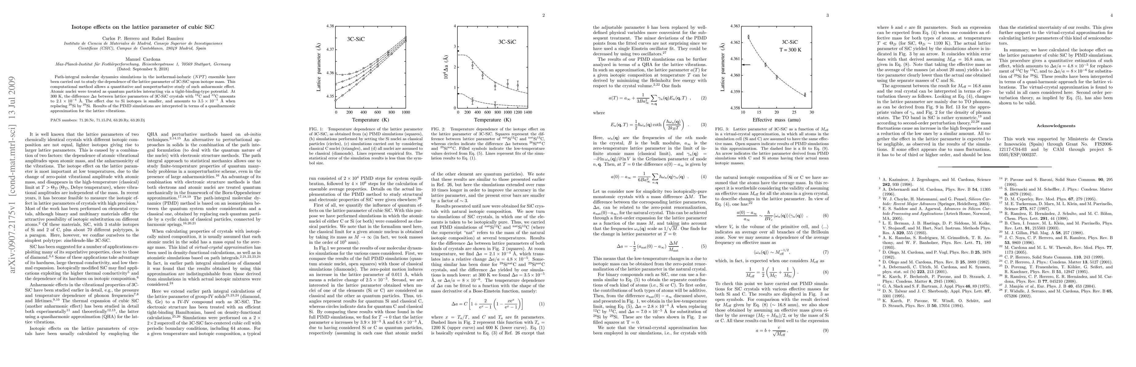 This study uses path-integral molecular dynamics simulations to investigate the lattice parameter changes in cubic SiC due to isotope mass differences. The simulations reveal a lattice parameter difference of 2.1 x 10^{-4} A between 12C and 13C isotopes, with a smaller effect of 3.5 x 10^{-5} A for Si isotopes.