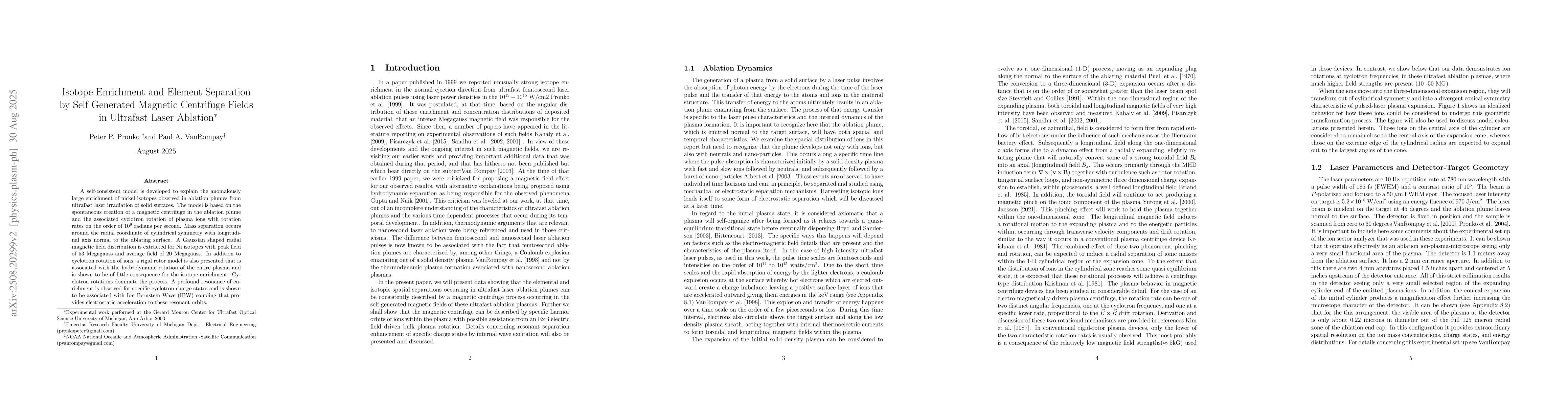 A self-consistent model is developed to explain the anomalously large enrichment of nickel isotopes observed in ablation plumes from ultrafast laser irradiation of solid surfaces. The model is based on the spontaneous creation of a magnetic centrifuge in the ablation plume and the associated cyclotron rotation of plasma ions with rotation rates on the order of 10^9 radians per second. Mass separation occurs around the radial coordinate of cylindrical symmetry with longitudinal axis normal to the ablating surface. A Gaussian shaped radial magnetic field distribution is extracted for Ni isotopes with peak field of 53 Megagauss and average field of 20 Megagauss. In addition to cyclotron rotation of ions, a rigid rotor model is also presented that is associated with the hydrodynamic rotation of the entire plasma and is shown to be of little consequence for the isotope enrichment. Cyclotron rotations dominate the process. A profound resonance of enrichment is observed for specific cyclotron charge states and is shown to be associated with Ion Bernstein Wave (IBW) coupling that provides electrostatic acceleration to these resonant orbits.