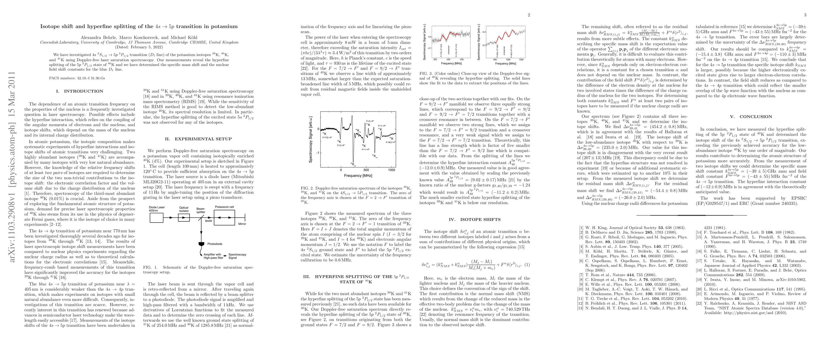 We have investigated $4s\;^2S_{1/2} \rightarrow 5p\;^2P_{1/2}$ transition ($D_1$ line) of the potassium isotopes $^{39}$K, $^{40}$K, and $^{41}$K using Doppler-free laser saturation spectroscopy. Our measurements reveal the hyperfine splitting of the $5p\;^2P_{1/2}$ state of $^{40}$K and we have determined the specific mass shift and the nuclear field shift constants for the blue $D_1$ line.