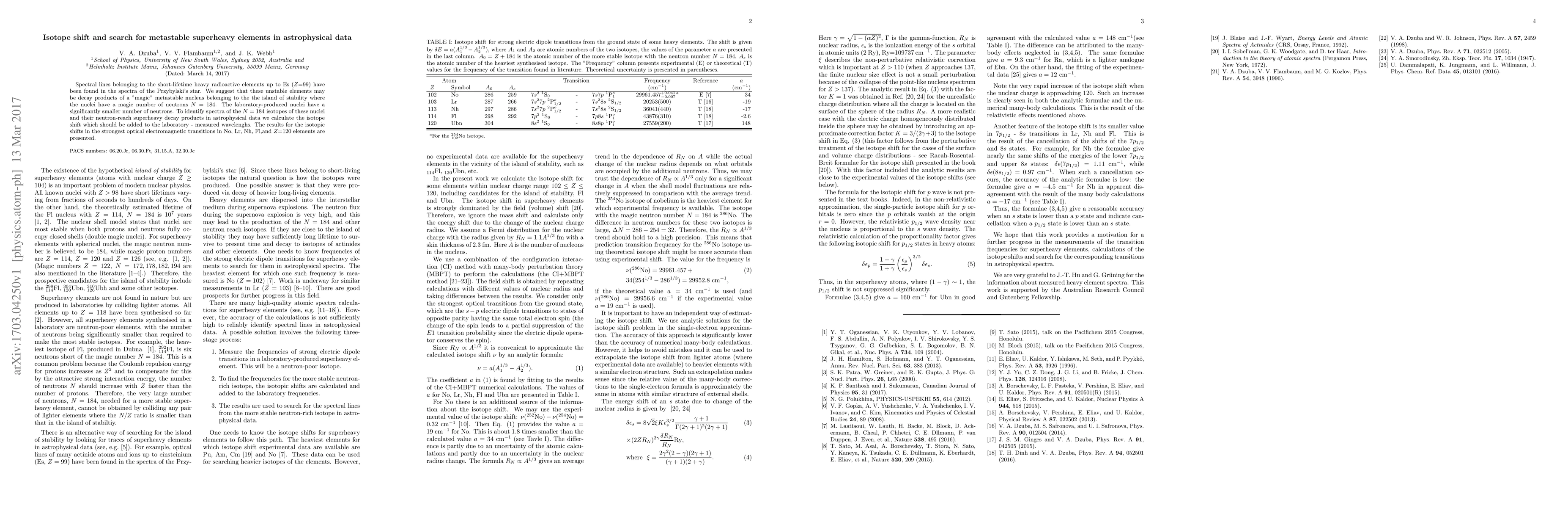 This paper investigates spectral lines from short-lived heavy elements up to Es ($Z$=99) in Przybylski's star, proposing they may originate from a metastable nucleus with $N=184$ neutrons. It calculates isotope shifts to identify potential $N=184$ isotopes and their superheavy decay products in astrophysical data.