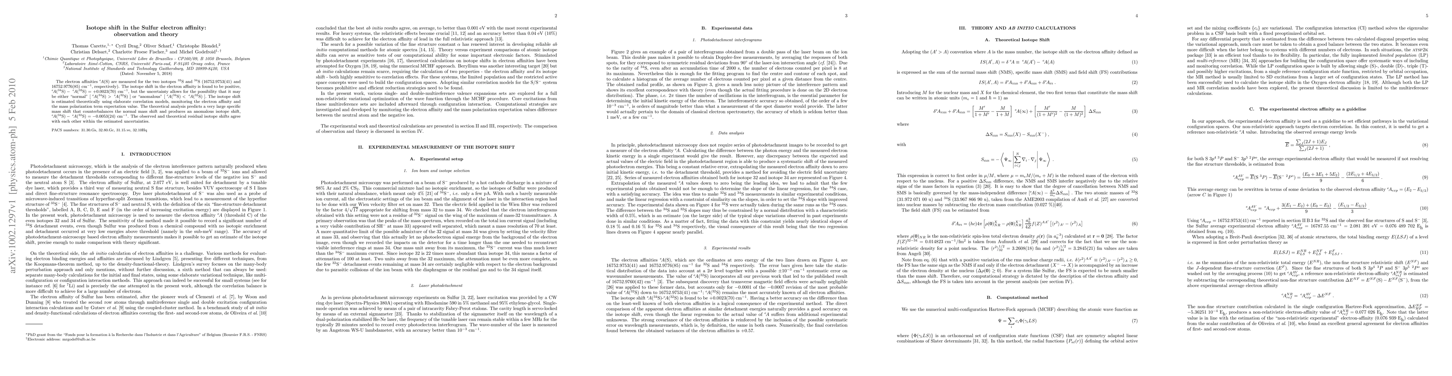 Researchers measured the electron affinity of sulfur isotopes 32S and 34S and found a small positive isotope shift, with theoretical analysis predicting an anomalous shift that matches within uncertainties.