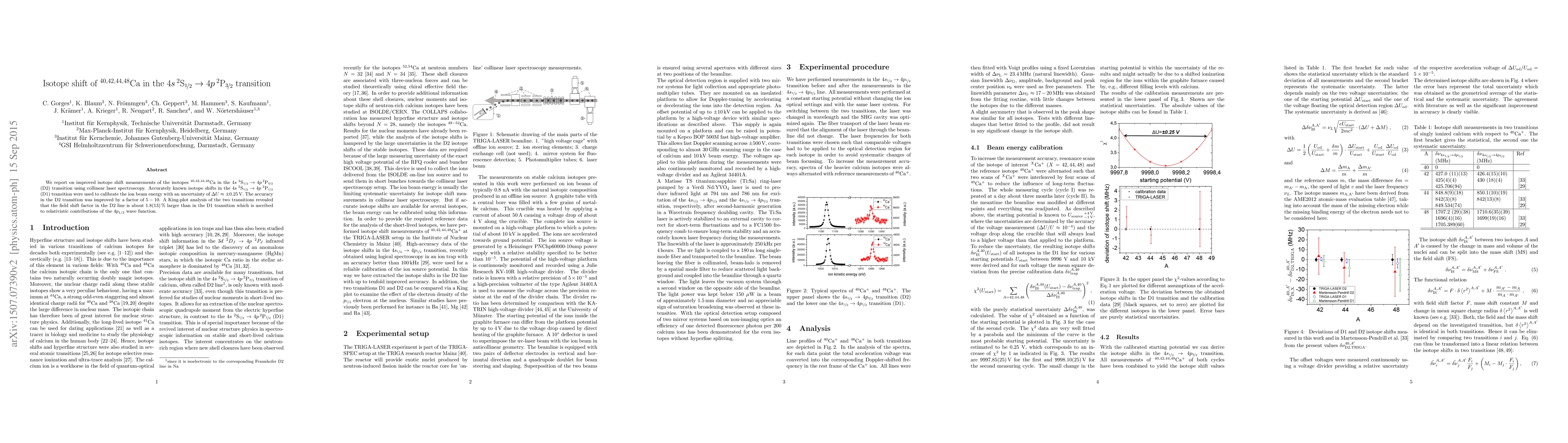 We report on improved isotope shift measurements of the isotopes $^{40,42,44,48}$Ca in the $4s\,^2 \rm{S}_{\frac{1}{2}} \rightarrow 4p\,^2\rm{P}_{\frac{3}{2}}$ (D2) transition using collinear laser spectroscopy. Accurately known isotope shifts in the $4s\,^2 \rm{S}_{\frac{1}{2}} \rightarrow 4p\,^2\rm{P}_{\frac{1}{2}}$ (D1) transition were used to calibrate the ion beam energy with an uncertainty of $\Delta U \approx \pm 0.25$ V. The accuracy in the D2 transition was improved by a factor of $5 - 10$. A King-plot analysis of the two transitions revealed that the field shift factor in the D2 line is about 1.8(13) % larger than in the D1 transition which is ascribed to relativistic contributions of the $4p_{1/2}$ wave function.