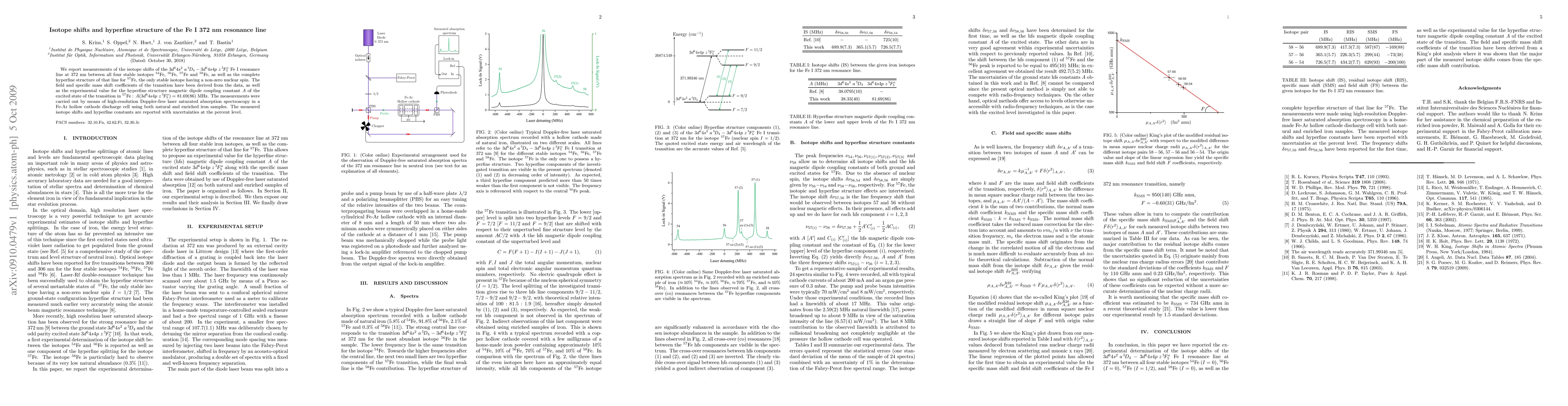We report measurements of the isotope shifts of the $3d^64s^2 a ^5D_4 - 3d^64s4p z ^5F_5^o$ Fe I resonance line at 372 nm between all four stable isotopes $^{54}$Fe, $^{56}$Fe, $^{57}$Fe, and $^{58}$Fe, as well as the complete hyperfine structure of that line for $^{57}$Fe, the only stable isotope having a non-zero nuclear spin. The field and specific mass shift coefficients of the transition have been derived from the data, as well as the experimental value for the hyperfine structure magnetic dipole coupling constant $A$ of the excited state of the transition in $^{57}$Fe: $A(3d^64s4p z ^5F_5^o) = 81.69(86)$ MHz. The measurements were done by means of Doppler-free laser saturated-absorption spectroscopy in a Fe-Ar hollow cathode using both natural and enriched iron samples. The measured isotope shifts and hyperfine constants are reported with uncertainties at the percent level.