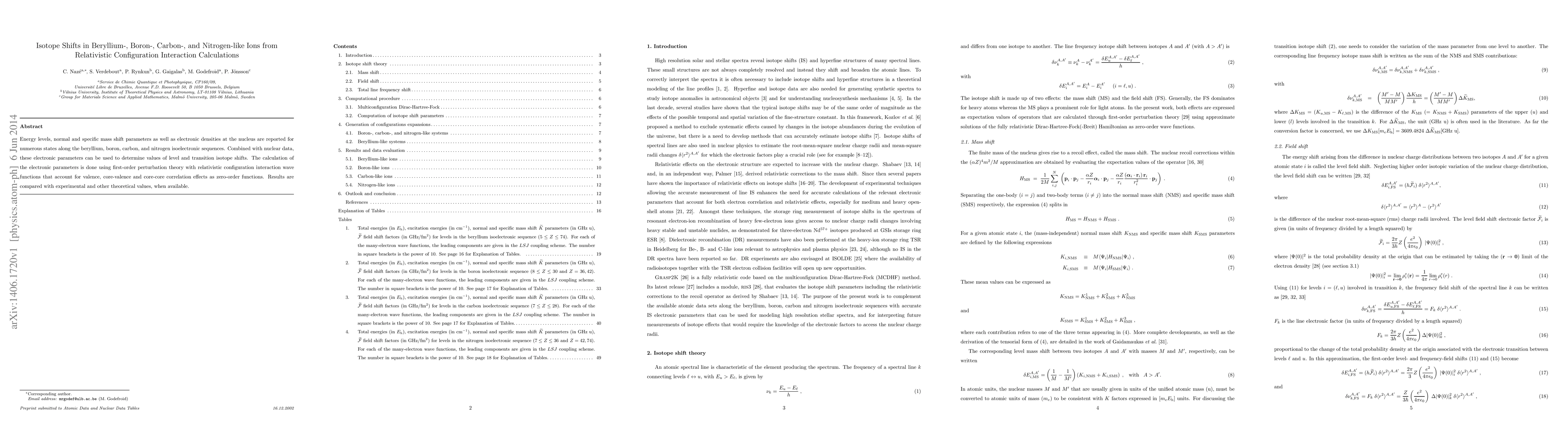 This paper reports energy levels and isotope shift parameters for beryllium, boron, carbon, and nitrogen isoelectronic sequences, calculated using relativistic configuration interaction methods. These parameters, including electronic densities at the nucleus, are compared with experimental and theoretical data to determine level and transition isotope shifts.
