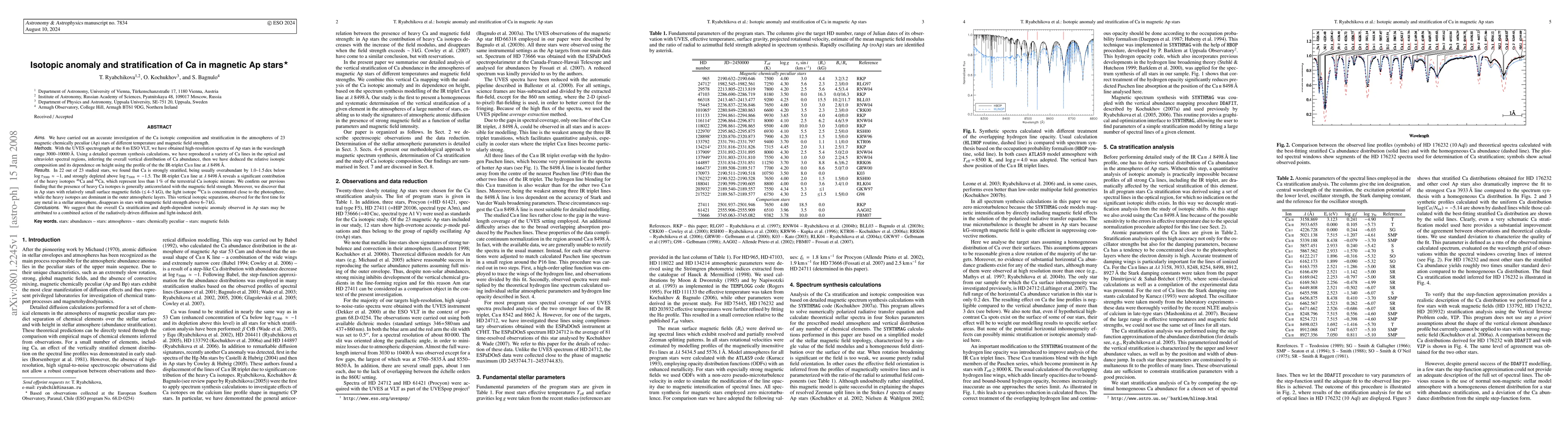 The research investigates the calcium (Ca) isotopic composition and stratification in 23 magnetic Ap stars. Utilizing high-resolution spectra from the VLT and spectrum synthesis calculations, the study finds Ca is strongly stratified in most stars, with overabundance below certain atmospheric layers and depletion above. Heavy Ca isotopes (46Ca, 48Ca) are significantly present, anticorrelating with magnetic field strength. In Ap stars with weaker magnetic fields, light isotope 40Ca is near the photosphere, while heavy isotopes dominate above, a unique vertical isotopic separation. This separation disappears in stars with stronger fields (>6-7 kG). The findings suggest radiatively-driven diffusion and light-induced drift contribute to the observed Ca stratification and isotopic anomalies.