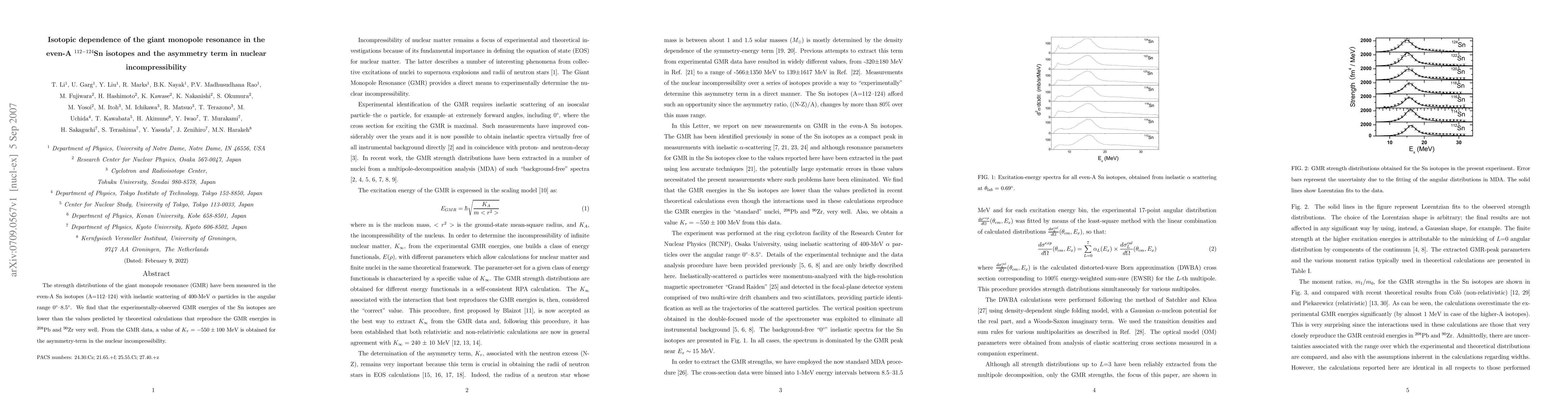 This study measures the giant monopole resonance (GMR) in even-A Sn isotopes (A=112-124) using inelastic scattering, revealing lower GMR energies than theoretical predictions. The GMR data yield an asymmetry-term value of $K_{\tau} = -550 \pm 100$ MeV for nuclear incompressibility.