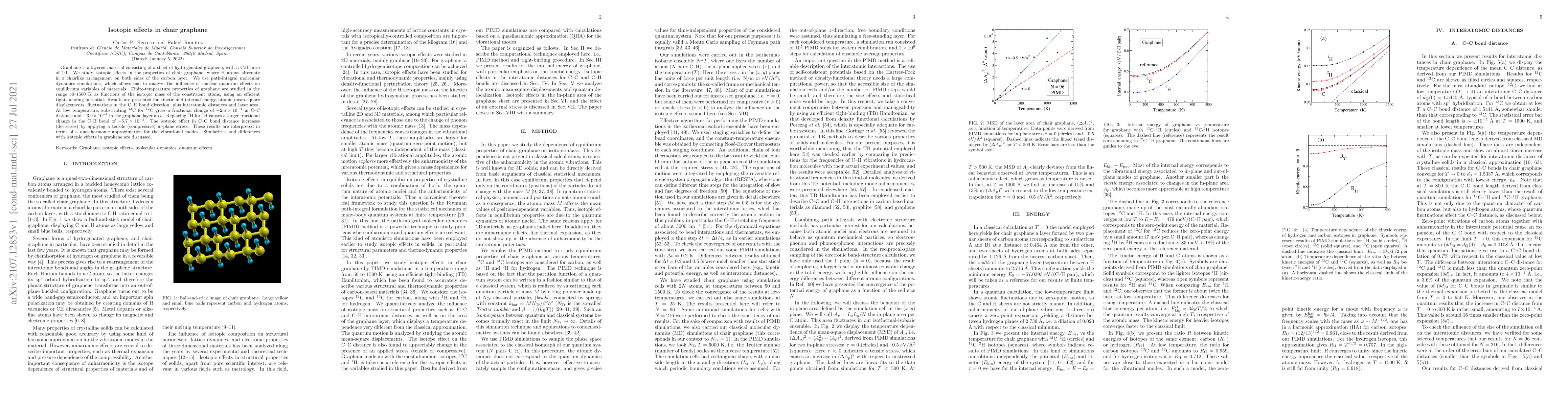 This study investigates isotopic effects in chair graphane using path-integral molecular dynamics simulations, revealing significant changes in kinetic and internal energy, atomic mean-square displacements, and interatomic distances with varying isotopic masses. Notably, replacing $^2$H with $^1$H causes a larger fractional change in the C--H bond than substituting $^{13}$C for $^{12}$C, with stress influencing these effects.