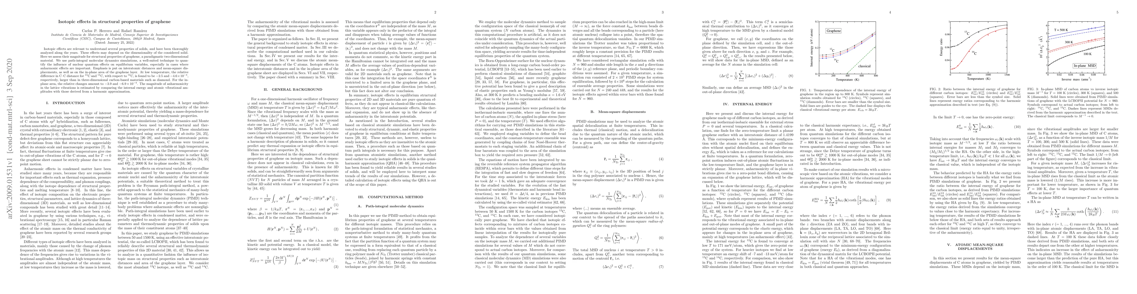 Isotopic effects are relevant to understand several properties of solids, and have been thoroughly analyzed along the years. These effects may depend on the dimensionality of the considered solid. Here we assess their magnitude for structural properties of graphene, a paradigmatic two-dimensional material. We use path-integral molecular dynamics simulations, a well-suited technique to quantify the influence of nuclear quantum effects on equilibrium variables, especially in cases where anharmonic effects are important. Emphasis is put on interatomic distances and mean-square displacements, as well as on the in-plane area of the graphene layer. At low temperature, the relative difference in C--C distance for $^{13}$C and $^{14}$C, with respect to $^{12}$C, is found to be $-2.5$ and $-4.6 \times 10^{-4}$, respectively, larger than in three-dimensional carbon-based materials such as diamond. For the in-plane area, the relative changes amount to $-3.9$ and $-6.9 \times 10^{-4}$. The magnitude of anharmonicity in the lattice vibrations is estimated by comparing the internal energy and atomic vibrational amplitudes with those derived from a harmonic approximation.