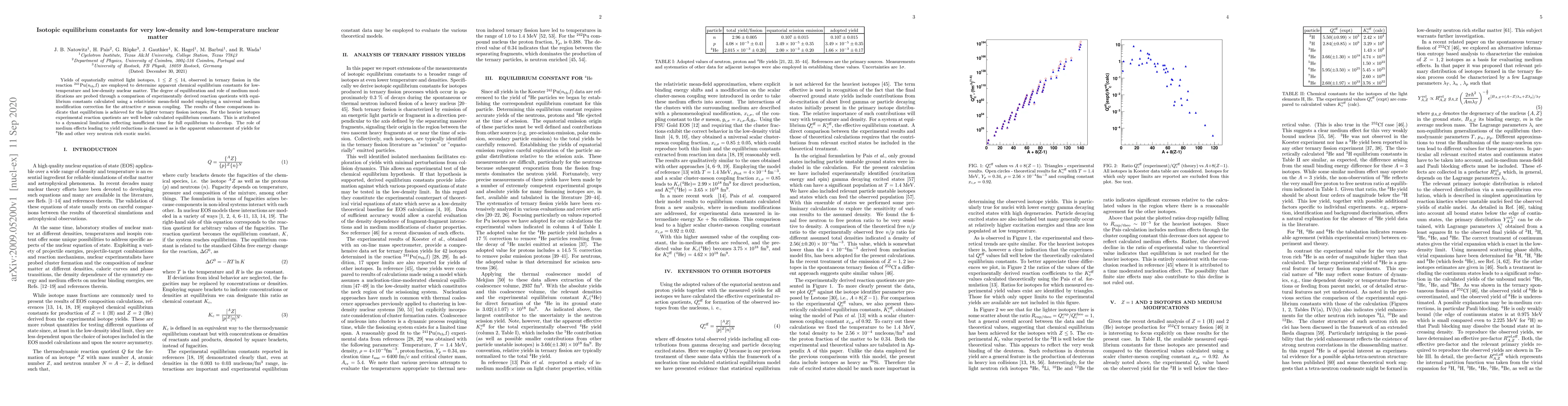 Yields of equatorially emitted light isotopes, $1\le Z\le 14$, observed in ternary fission in the reaction $^{241}$Pu($n_{\rm th}$,f) are employed to determine apparent chemical equilibrium constants for low-temperature and low-density nuclear matter. The degree of liberation and role of medium modifications are probed through a comparison of experimentally derived reaction quotients with equilibrium constants calculated using a relativistic mean-field model employing a universal medium modification correction for the attractive $\sigma$ meson coupling. The results of these comparisons indicate that equilibrium is achieved for the lighter ternary fission isotopes. For the heavier isotopes experimental reaction quotients are well below calculated equilibrium constants. This is attributed to a dynamical limitation reflecting insufficient time for full equilibrium to develop. The role of medium effects leading to yield reductions is discussed as is the apparent enhancement of yields for $^8$He and other very neutron rich exotic nuclei.